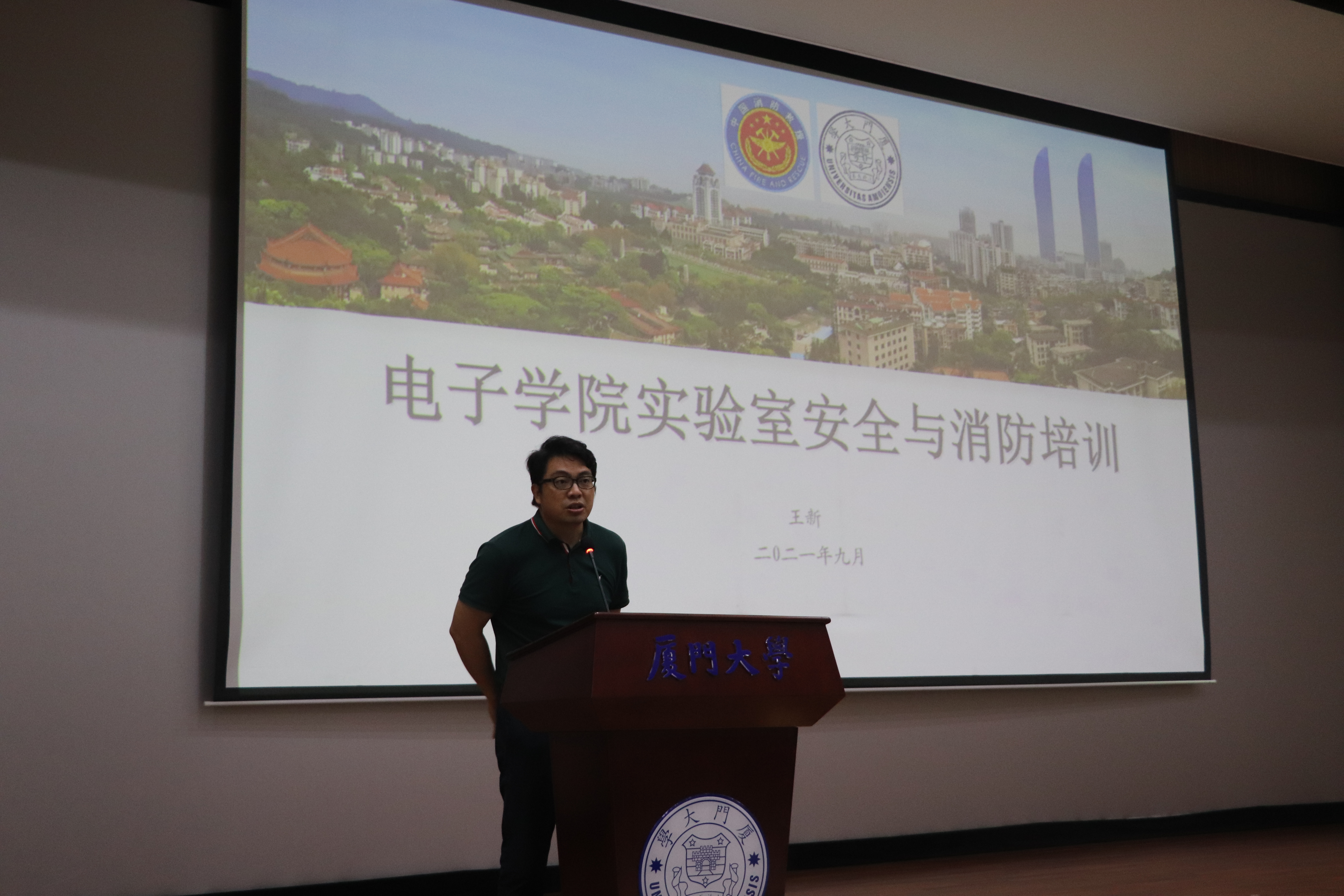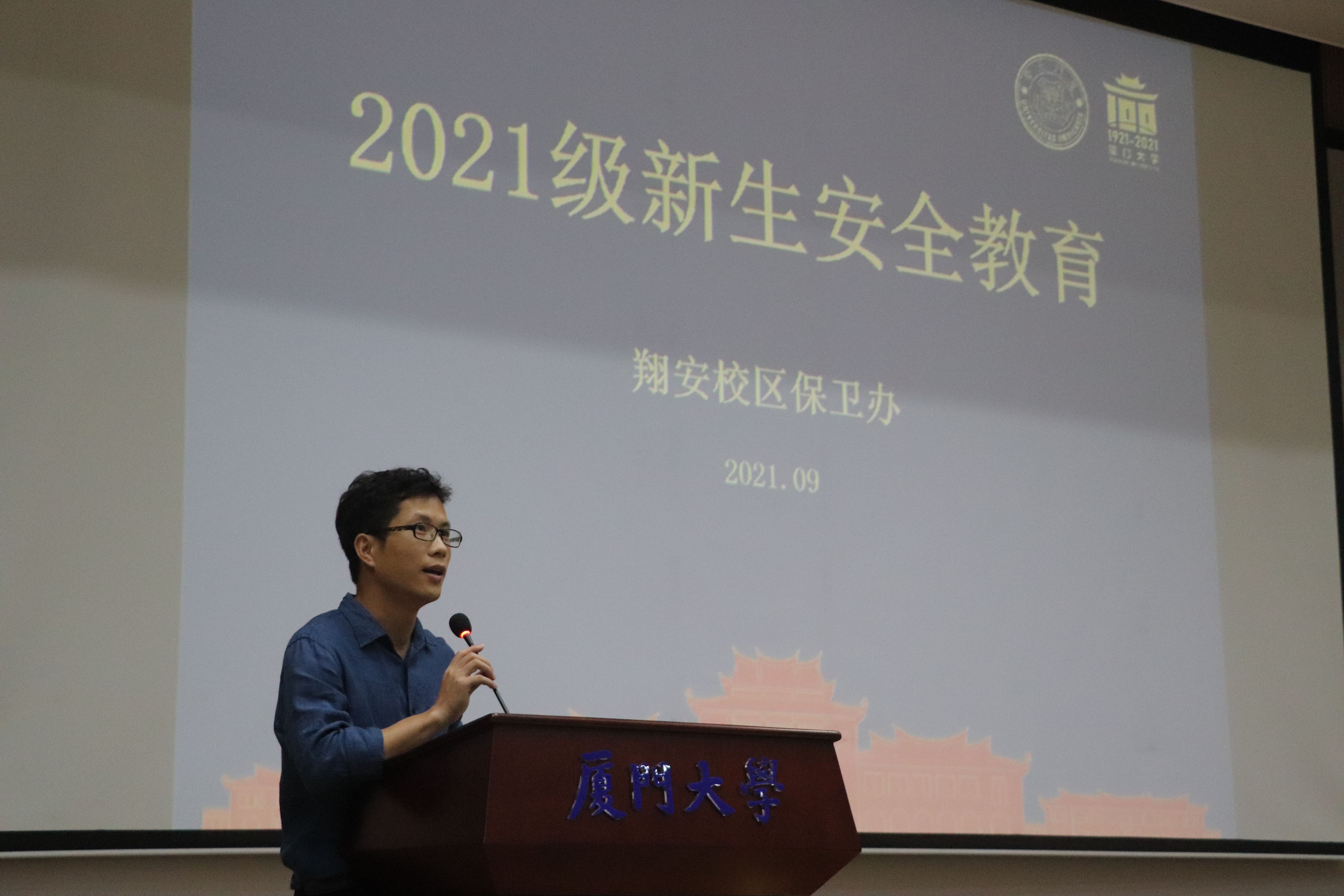 紧随着开学典礼之后,2021级新生安全教育也及时展开。电子科学系工程师王新对大家进行了实验室安全教育,向大家强调了消防安全的重要性、普及安全相关的法律法规以及责任划分,提醒大家大部分安全事故都是由于人为操作失误引起,告诫大家要严格执行操作规程,不要心存侥幸心理。翔安保卫办左霆华进一步补充了交通安全以及国家安全,教导大家如何在生活中反间防谍防渗透,防暴恐。