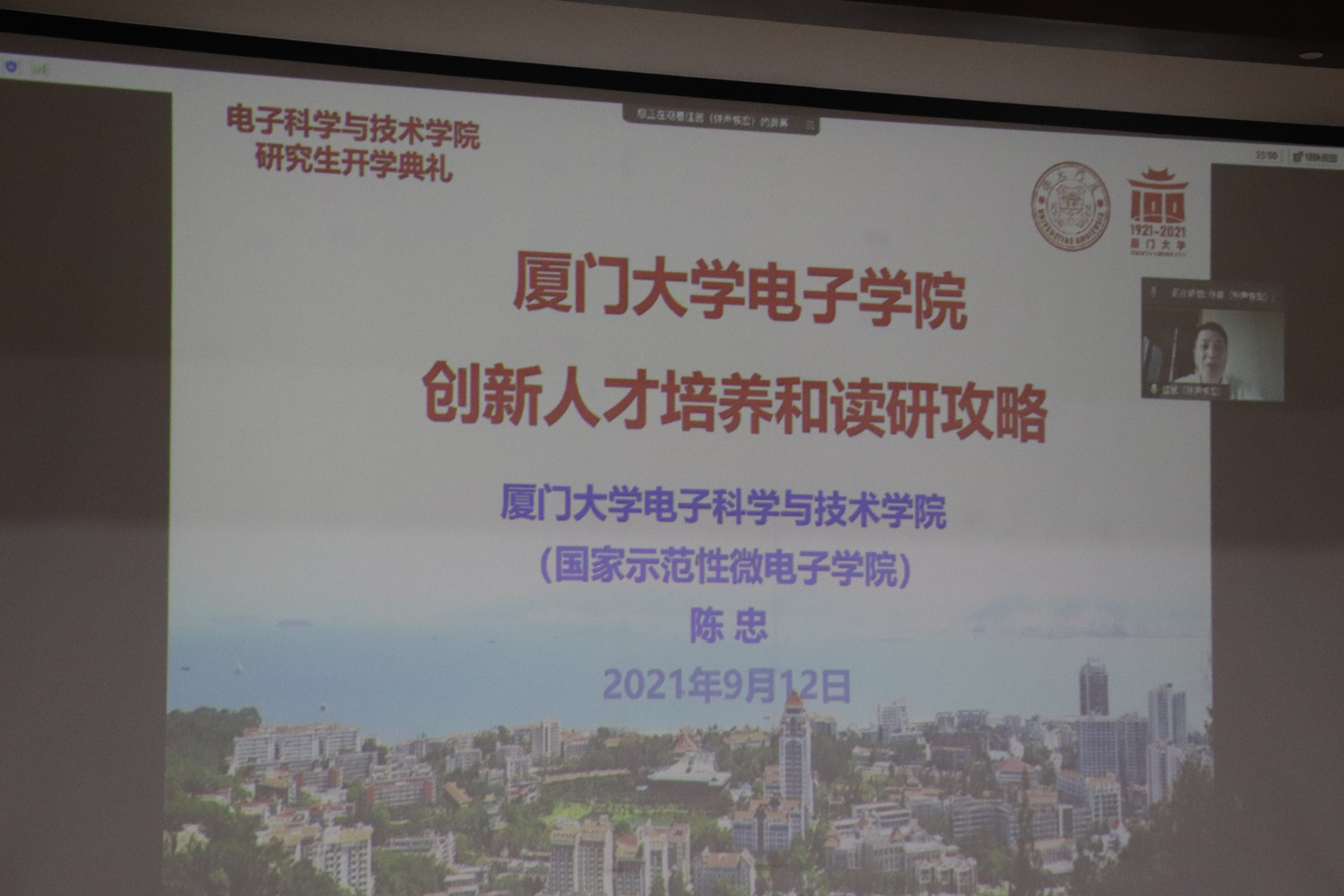 典礼首先由陈忠做“厦门大学电子学院创新人才培养和读研攻略”的专题报告。陈忠的报告紧抓研究生入学后最关切的问题——认识自己、认识学院,并为新生条理清晰地展示了“读研攻略”。陈忠指出,读研期间一定要学会认识自己,搞清楚自己的定位非常重要。“中国目前的研究生314万,依然属于社会精英群体,搞清楚自己的定位,才能更好地为国家做贡献”。耐心教育新生的同时,他还督促大家要培养独立工作的能力,不能过分依赖导师。随后,陈忠向大家简单介绍了学院的总体情况,包括学院的历史渊源、学院的杰出院友、学院机构的设置,以及学院在科研、竞赛、社会实践等诸多方面的成果。最后,陈忠鼓励大家读研的过程是一个修行的过程,要有“独上高楼,望尽天涯路”的耐心,也要有“衣带渐宽终不悔”的恒心,只有如此,才能收获“暮然回首,那人却在灯火阑珊处”的喜悦,希望大家在厦大百年的辉煌历史成就上再谱新的篇章!