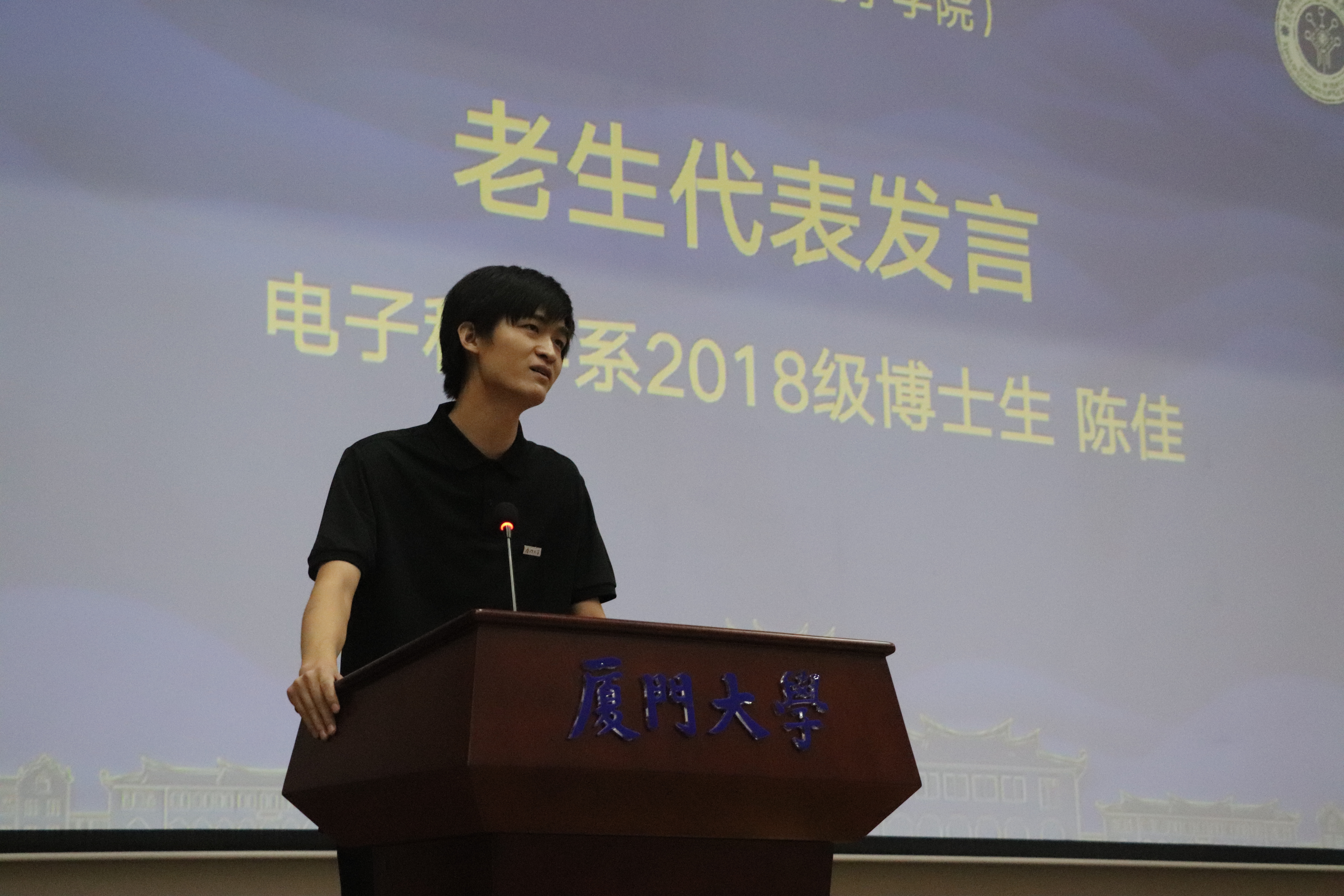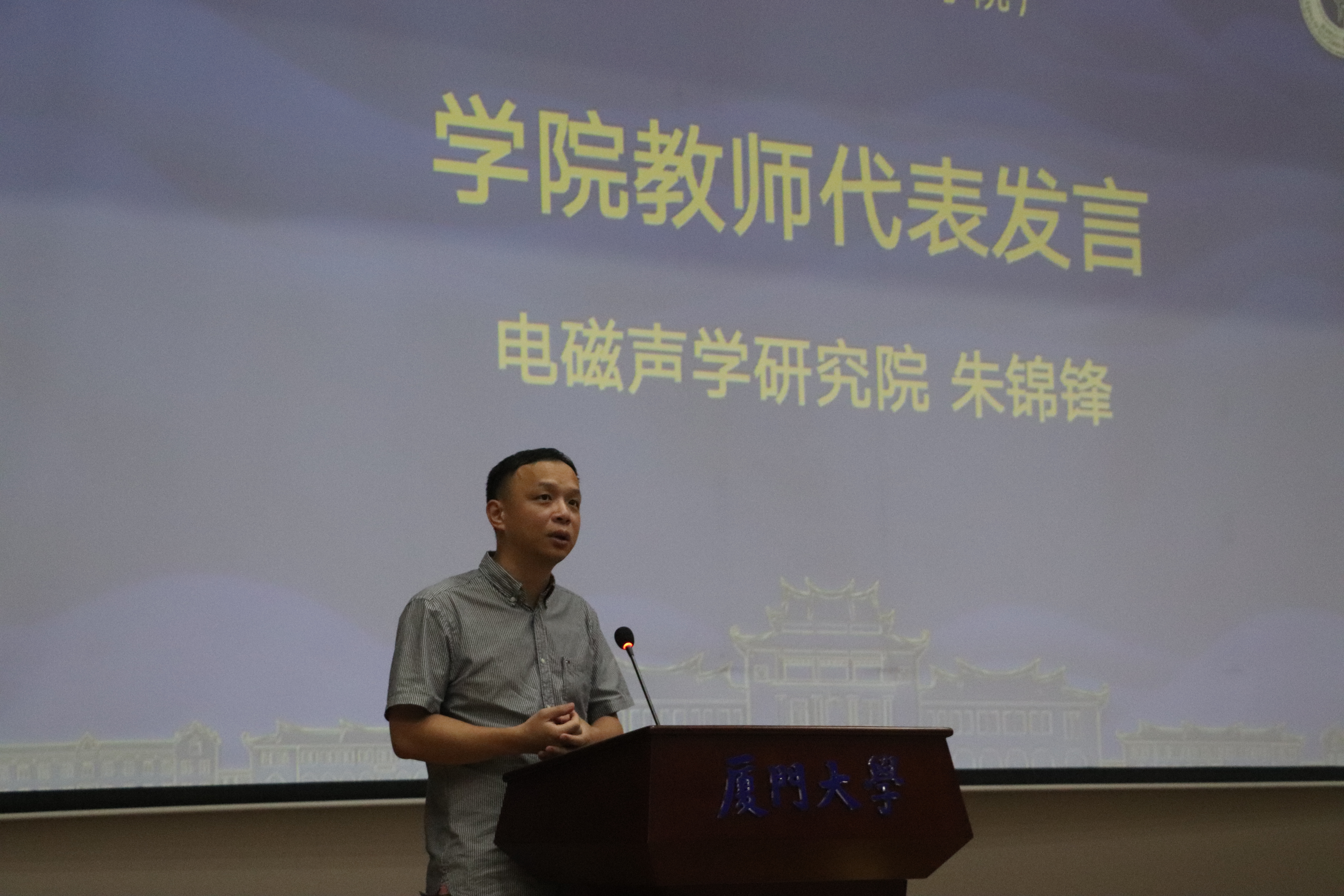 朱锦锋教授作为学院教师代表进行发言。朱锦锋认为,研究生对于导师来说,是科研上的好朋友、是研究上的战友,是驱动国家科研反战与厦大“双一流”学科建设的重要力量。朱锦锋悉数分享了自己作为研究生的学习心得,以及作为导师时候的教育心得。提醒大家研究生学习过程中必须具备的三个心态:一是恒心、二是沟通、三是追求。“研究生的科研必须经历从量变到质变的过程、从0到1的过程”,“类似本科生期间的期末突击搞不得”。朱锦锋同时也强调,在搞科研的时候不能钻牛角尖,不要偏执,注意多和导师同学沟通,闭门造车不可取。朱锦峰希望大家能保持对崇高理想的追求,不要过度在意眼前的得失,电子学院肩负着国家扶持以电子信息为代表的高科技发展的重任,同学们风华正茂,正处在人生创造力的巅峰,他希望大家能在电子信息的海洋乘风破浪,青出于蓝而胜于蓝,能够成为国家的栋梁之才,厦大的骄傲,放飞梦想、收获成功。