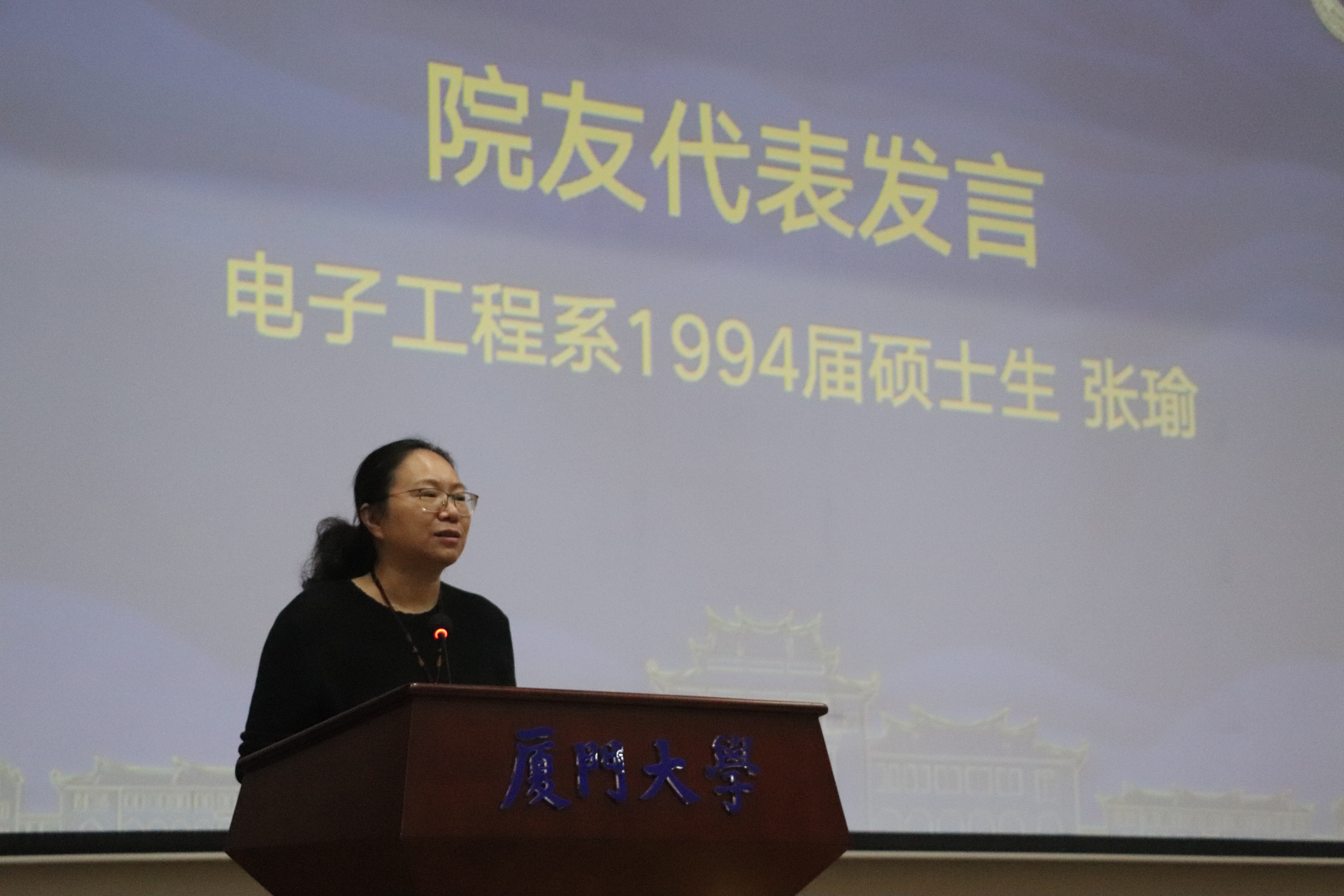 电子工程系1994届的张瑜学姐向大家分享自己读研时候的心得经历。她表示,母校对自身的培养可谓情深恩重,即便毕业二十余载,依旧难忘老师的关心爱护。看到母校如今各项发展齐头并进,朝气蓬勃,她不禁回忆起自己多年前厦大求学时的艰苦历程,借此勉励学弟学妹,无论环境如何,自强不息,止于至善永远是我们每一个厦大人毕生的追求。在关于行业行情的介绍上,张瑜向大家表示,微电子与半导体是国家之重,她还向同学们简单介绍了名为模拟计算的“新赛道”,告诉大家要有恒心,要执着,希望大家打好基础,学精学透。学姐在最后送给两句话:“保持踏踏实实做事,认认真真做人”。