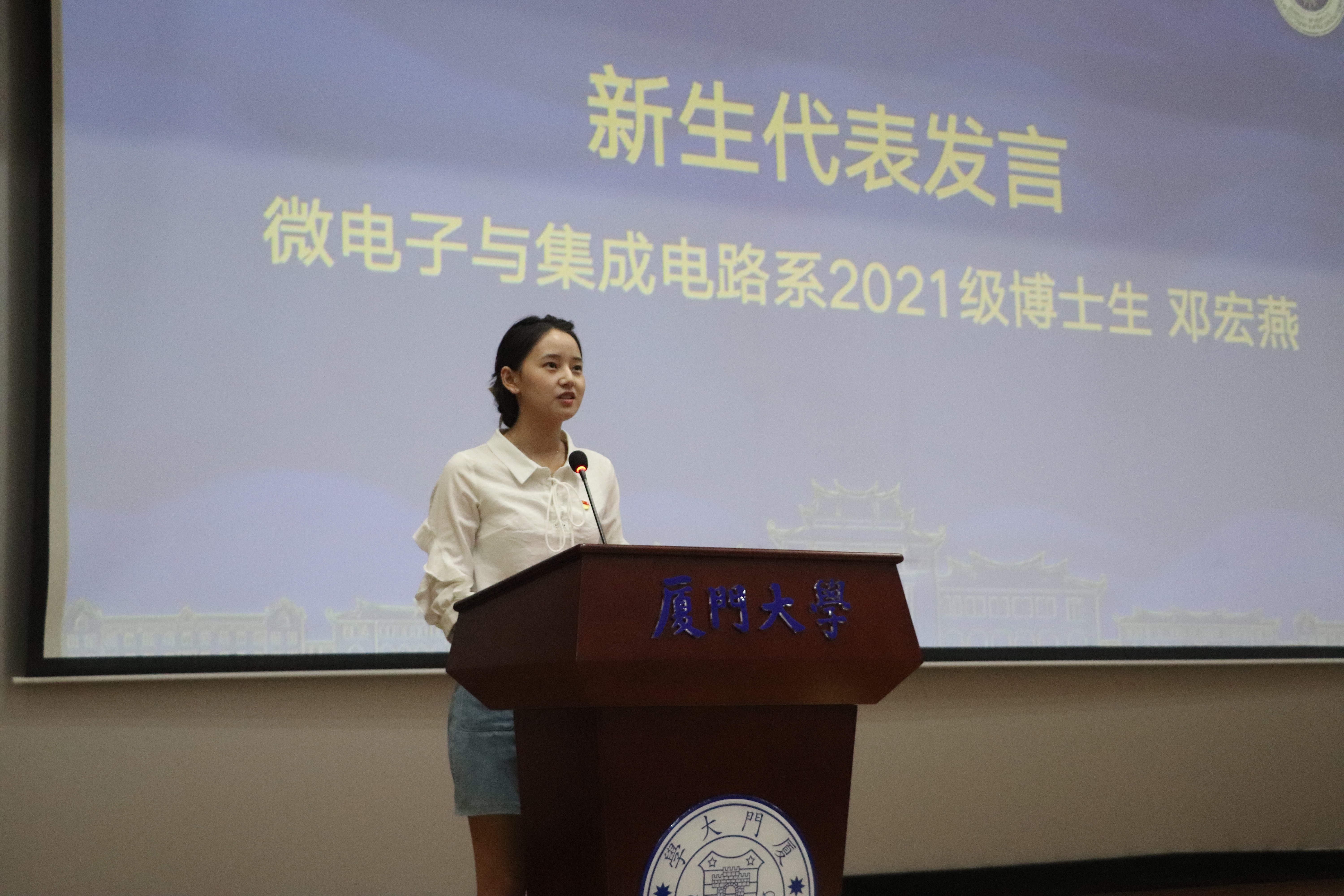 邓宏燕作为新生代表发言。她表示,自己和绝大多数的新生一样,在拿到录取通知书的一刻“无比的幸运与满足”。她讲到,自2008年起,中国进口芯片的花费超过了石油,同时我国的半导体产业错过了10年的发展机会,今年是电子学院院系调整后的第五个年头,选择了升学就是选择了继续奋斗,选择了电子学院就是选择了为中国的“芯片困境”贡献力量,希望能和同学们一道,在这条充满艰难险阻的道路上,不退缩,不动摇,不孤单。
