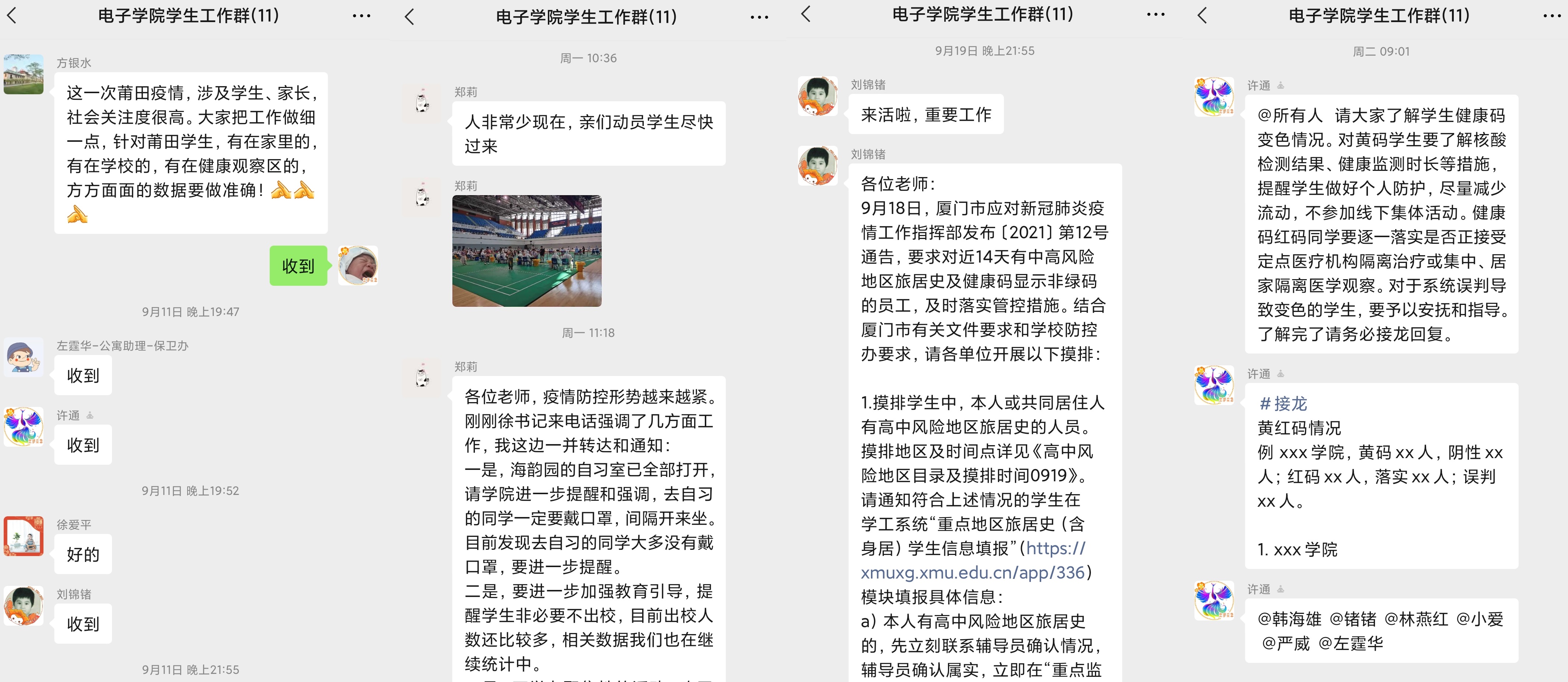 系统摸排,精细管理。9月10日以来,学院学生工作组根据学校疫情防控要求,依托辅导员队伍、党员队伍和学生工作骨干,通过年级大会、宿舍走访、线上联络等形式,系统传达了学校疫情防控的最新政策,摸排了学生中高风险旅居史、参加核酸检测等情况,精准帮助学生落实集中隔离、居家隔离,轮番提醒学生参加核酸检测,做好健康打卡提醒和疫情防控数据信息收集、核实、报送等工作。针对校外居住学生,辅导员通过电话方式逐一关心慰问,了解学生饮食起居、学习生活以及核酸检测的困难与需求,帮助学生共同度过难关。