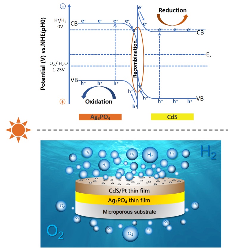 当前世界能源主要依赖高污染、不可再生的化石能源,而氢能是最理想、最清洁的可再生能源。然而目前氢气制取成本高,制约了它的普及。太阳能光解水制氢是获取廉价氢气的最优途径,其面临的最大挑战是光全解水技术难度大,虽然目前报道的最高光转化效率已超过1%,但离产业化所要求的5%还有很大差距。光解水是一个能量爬坡过程,需要吸收光能,而其中关键是光生电子和空穴的有效分离。直接Z型异质结能够有效分离电子和空穴,科学家们研究证明直接Z型光催化剂能够光全解水。然而,由于形成异质结前两种半导体费米能级差异,导致形成结后在空间电荷区能带弯曲使其氧化还原能力降低,对光催化效率影响很大。该团队注意到二维纳米材料形成异质结后(厚度约几纳米),其氧化还原能力并没有受到明显影响。受此启发,对上述异质结能带结构图进行深入研究后,在国际上首次提出“应用一种厚度不超出空间电荷区的异质结以高效光全解水的策略”,即在空间电荷区内调控异质结厚度以增强其氧化还原能力,从而提高其光催化效率。众所周知,CdS和Ag3PO4可见光照射下分别在还原水制氢和氧化水产氧方面表现突出,然而到目前为止,所报道的Ag3PO4-CdS异质结从未实现光全解水,这主要由于它们形成异质结后氧化还原能力明显下降。本团队利用镀膜工艺方面的优势,在微孔基底上制备了一系列厚度的Ag3PO4-CdS-Pt异质结光催化剂。在可见光照射下,厚度超过空间电荷区的样品不能分解水,而厚度在空间电荷区内的样品能全解水并随着厚度变薄其光转化效率迅速提高,实验中获得的最大光转化效率高达2%,达到国际领先水平。
