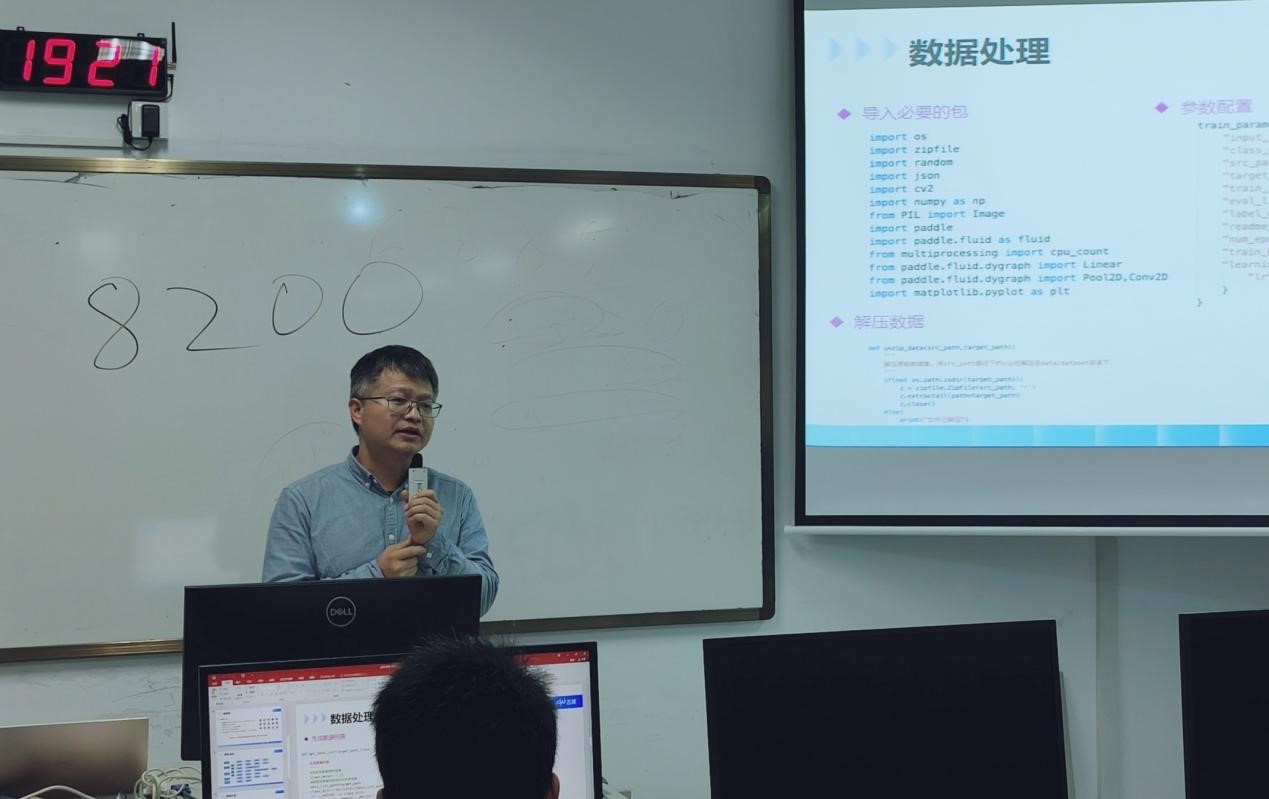 课堂上,陈华宾老师首先结合神经网络模型以及相关的数据集,明确生动地描述了任务整体流程,让学生了解了识别任务的整体思路。同时,他还对数据处理、模型设计等函数模块的代码进行了细致的讲解,列出了每个模块完成后的结果,让学生们深入了解了每个模块的作用,加深了学生们的理解。