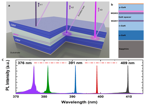 张保平教授课题组通过制备低损耗的谐振腔以及在有源区中引入周期性增益结构,成功实现了UVA波段GaN基VCSEL的可调谐低阈值光泵浦激射,发光波长覆盖376-409 nm的光谱范围。器件谐振腔采用厚度渐变的楔形结构,因此可利用腔长的变化实现对谐振腔内光场分布以及谐振波长的调制,在单个样品不同位置实现激射波长的渐变,从而实现发光波长的可调谐。