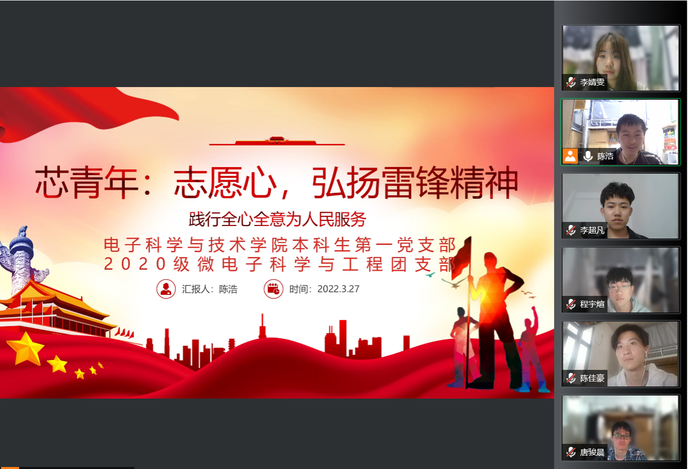 2022年3月5日是第59个学雷锋纪念日,这既是对雷锋同志最好的纪念,也是对雷锋精神的发扬光大。3月27日下午,电子科学与技术学院通过线上会议举办了“党建带团建,学习中国共产党人精神谱系”系列活动之“芯青年,志愿心,弘扬雷锋精神”学习活动。电子科学与技术学院本科生第一党支部党员和2020级微电子科学与工程班级团员共同参与。