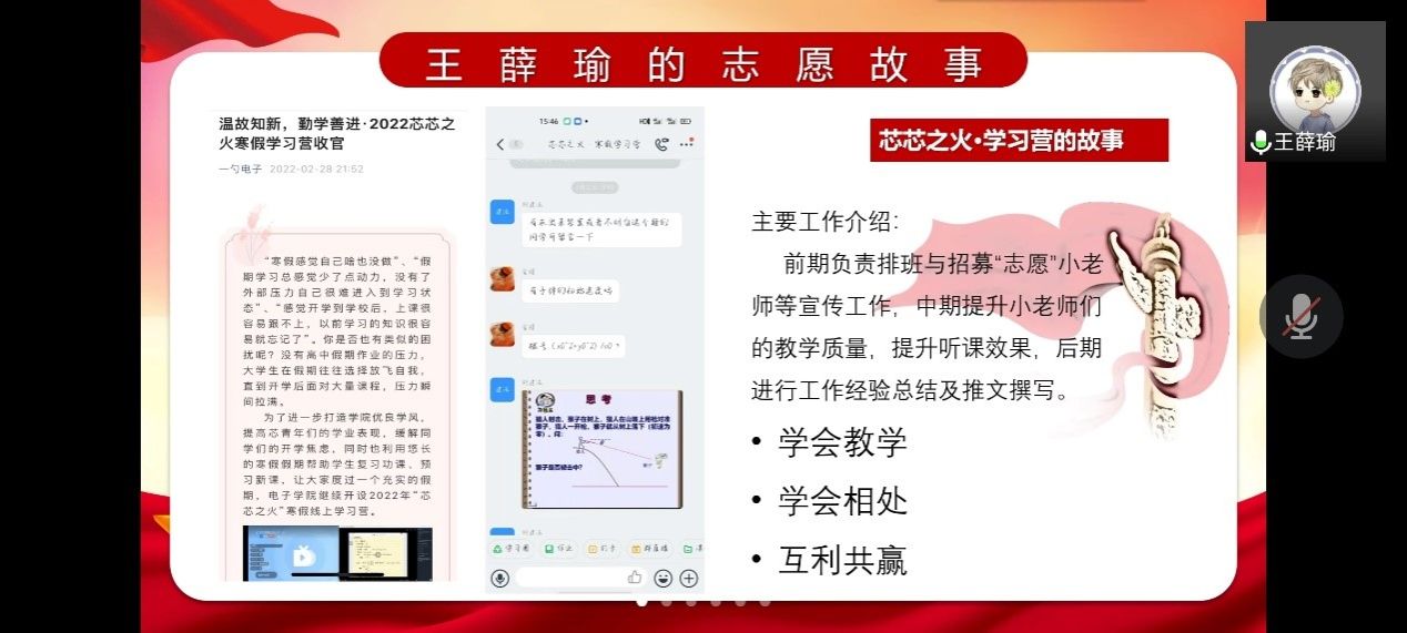 志愿者王薛瑜回顾了暑期芯芯之火学习营的授课经历,从前期宣传、组建“小老师”团队,到中期不断地对课堂反思调整,再到和听课同学的线上沟通交流,这次学习营帮助了很多同学回顾了以往学习的课程,也丰富了假期生活,是一个双赢的志愿活动,这类志愿服务让他收获到了知识。