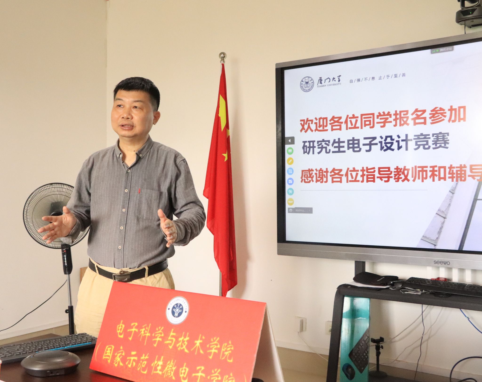 为强化研究生创新实践能力培养,在学校研究生院支持下,电子科学与技术学院于4月25日在思明校区海韵园科研二214和翔安校区南存钿楼A513室举办了中国研究生创新实践系列比赛之“兆易创新杯”第十七届中国研究生电子设计大赛解读会暨厦门大学选拔赛启动仪式,旨在通过广泛宣传、动员组织、认真指导,激励引导我校研究生参加高水平学科竞赛,增强创新创业意识,促进产学研深度融合发展。