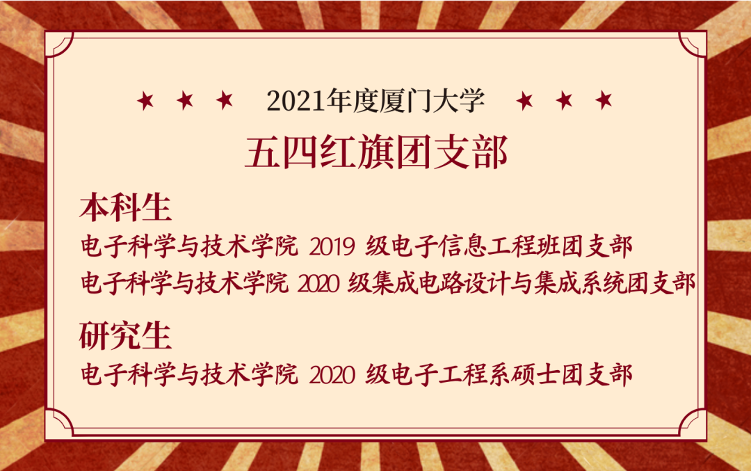 近日,共青团厦门大学委员会公布了《2021年度厦门大学共青团工作先进集体和先进个人拟表彰名单》。在本次表彰中,电子科学与技术学院共有3个团支部荣获“2021年度厦门大学五四红旗团支部”,4人荣获“2021年度厦门大学优秀团支部(团总支)书记”,34人荣获“2021年度厦门大学优秀共青团员”。现将名单公布如下。