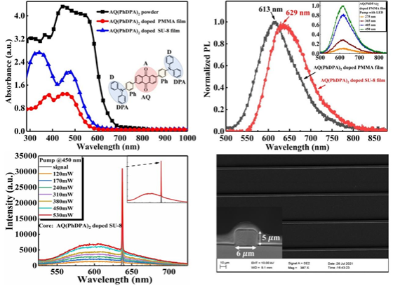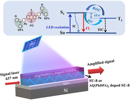 光波导放大器作为补偿各类光损耗的重要光子器件,在硅光平面集成中应用广泛。有机发光分子掺杂的聚合物材料具有低成本、环境友好和器件化工艺简单等特点,适合用来制作光波导放大器,然而,用于受激辐射的单重态激子寿命短,容易系间窜跃(Intersystem crossing, ISC)至三重态,导致单重态激子猝灭,制约着这类材料在光放大领域的应用。张丹课题组针对这一问题,提出采用热激发延迟荧光(Thermally activated delayed fluorescence, TADF)分子AQ(PhDPA)2作为有源物质,利用该分子的反向系间窜跃过程( Reverse intersystem crossing, RISC)和在蓝紫光波段具有强吸收的特点,实现了低功率LED泵浦下的红光放大。