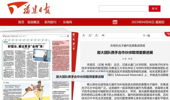 近日,福建省人民政府、厦门大学官网,福建日报、东南网、福建科技公众号等多家媒体,广泛发布、报道了我院张丹教授团队在有机光子器件与集