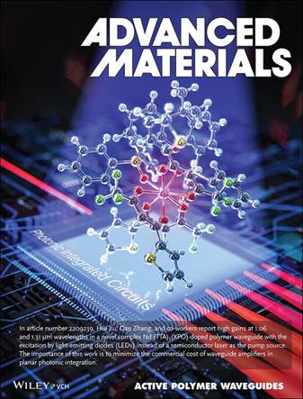 该项成果以 “High-Gain of NdⅢ Complex Doped Optical Waveguide Amplifiers at 1.06 and 1.31 µm Wavelengths Based on Intramolecular Energy Transfer Mechanism” 为题发表在国际顶尖期刊《Advanced Materials》上,并被选为当期卷首文章(frontispiece)。