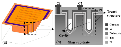 在本文中,基于激光诱导湿法刻蚀技术实现的玻璃基上阵列的盲槽结构,设计了一款金属-绝缘-金属的三维电容。并通过加厚电极和引出电路的设计优化进一步降低了电容器的寄生电感和寄生电容,实现拥有更低损耗更加性能的高密度电容器。