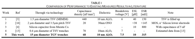 近日,我院于大全教授团队在《IEEE Electron Device Letters》杂志上发表了题为“Development of Low Cost Glass Based Deep Trench Capacitor for 3D Packaging”的研究成果,报道了利用玻璃通孔和原子层沉积工艺制作的一款低损耗、高电容密度的三维电容器。