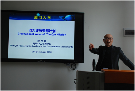 2018年12月14日,厦门大学海韵园行政楼C414会议室,应我院蔡志平教授的邀请,中山大学叶贤基教授老师做了题为“引力波与天琴计划”的学术报告,光电子技术研究所相关老师、学院部分研究生参加了讲座。