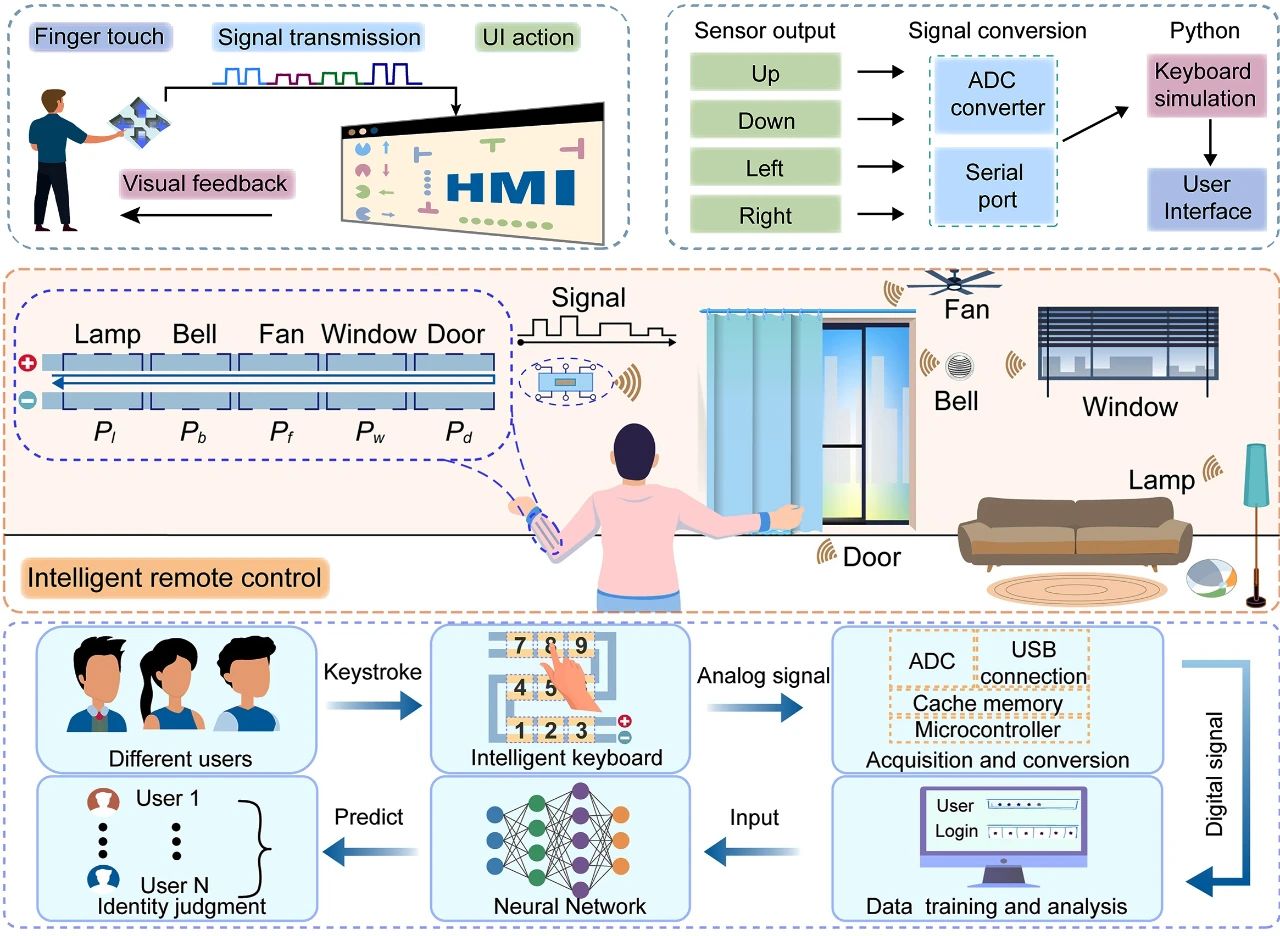 智能物联网 (AIoT)技术旨在建立人与连接设备之间紧凑的信息和能量交互。人机界面作为AIoT的重要媒介,扮演着连接虚拟和现实之间的角色。触摸屏作为一种人机界面,多采用导电性强、透光率高的氧化铟锡(ITO)透明导电膜来实现与外界的交互。然而,由于ITO的易碎性以及不可弯曲性,这使得它无法集成在物体的曲面上进行自由的交互。柔性电子器件可以与人体或物体集成来识别用户的交互意图,是刚性材料缺陷的有效解决方案。集成的电子器件一旦被弯曲可能会产生变形,将导致部分互连失效,从而损坏传感性能。并且,当前的柔性电子器件通常是由众多离散电子单元组成的像素化传感阵列,这给信号传输带来了布线复杂、结构复杂、串扰等问题。准确识别用户的真实交互意图需要集成的电子器件与人工智能相结合来处理复杂的数据。这些都给实际应用中实现更智能的人机交互带来重大挑战。