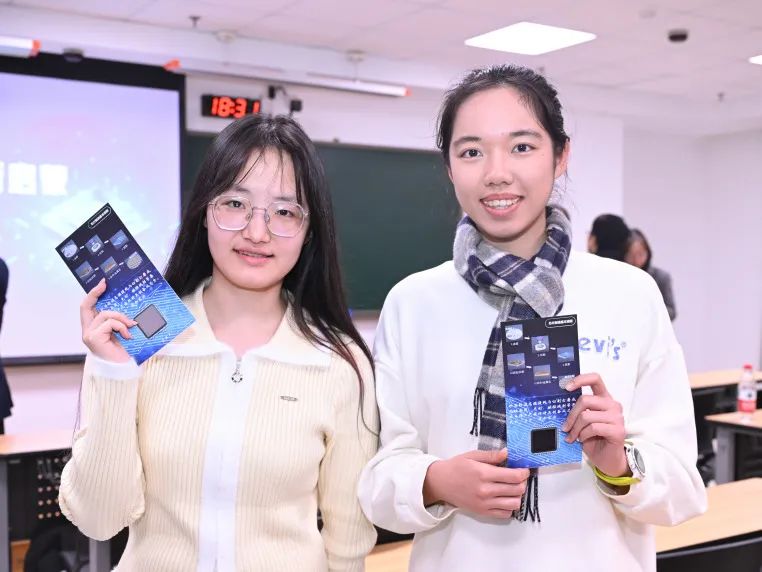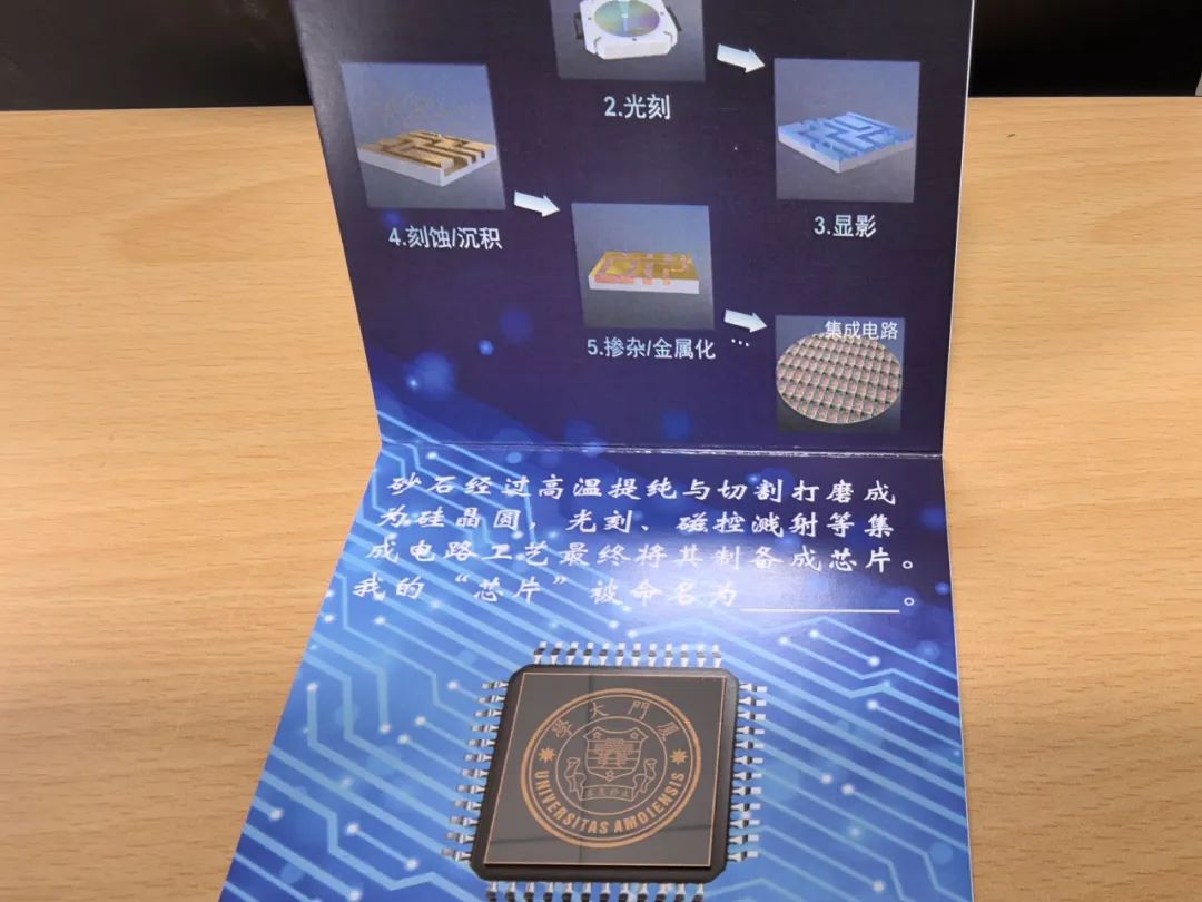 最后,张荣为同学们分发刻有精美厦大校徽的芯片工艺品。该工艺品是课程工艺实训环节中同学身着无尘服走进国家集成电路产教融合创新平台超净间学习光刻工艺和物理气相沉积等重要的芯片制造技术,亲手完成剥离、划片等操作所得的课程作品。在同学们的欢声笑语中,《芯片世界中的创新启蒙》本学期最后一堂课圆满落幕。