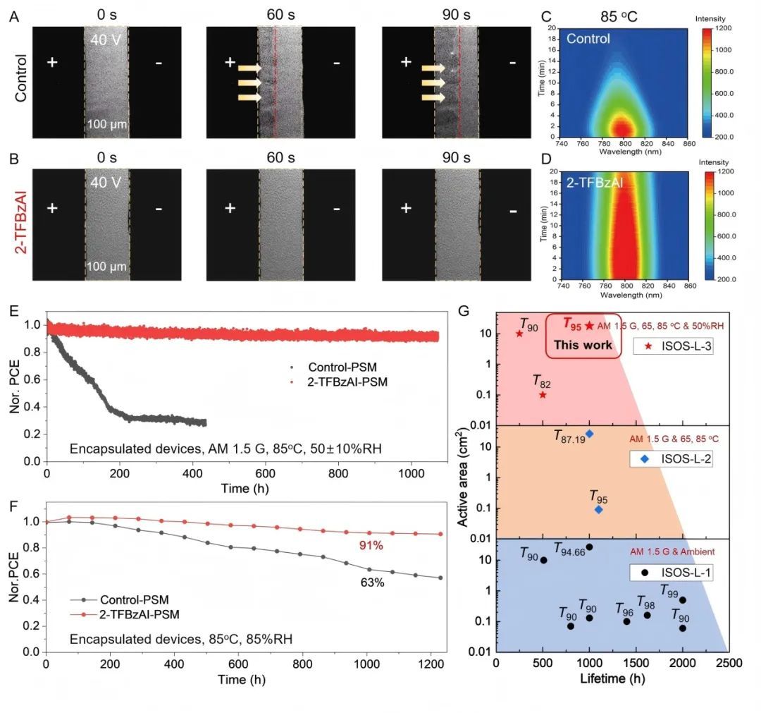 更值得关注的是,这些组件在严格的国际光伏稳定性标准(ISOS)下表现出优异的稳定性。尤其是在ISOS-L-3协议下(85°C、50% ± 10%湿度、最大功率点跟踪测试),6×6 cm2组件在1000小时加速老化测试中,仍保持初始效率的95%,刷新了钙钛矿n-i-p结构太阳能电池组件的稳定性纪录。
