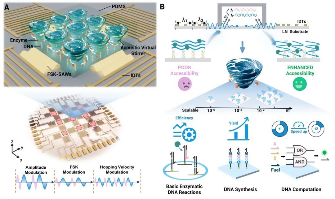 针对这一难题,本研究开发了一种微尺度声学虚拟搅拌子(AVS)技术,通过构建可规模化拓展的集成式微反应器件,实现芯片中多种反应流程的效率与产率提升。该AVS技术在铌酸锂基底设计声表面波单元阵列,每个单元均可通过声学信号控制产生驻波场,并且通过可编程信号调制使声势阱或压力节点以可控的频率与幅度进行周期震荡,产生虚拟的搅拌子效应。在震荡的声势阱中,流体在梯度声辐射力及声流效应的作用下进行震荡和混合。不同于传统技术,该平台无需物理微结构介入,通过场调控方式进行作用,并控制搅拌速度与振幅,能够在微观到宏观大面积多个尺度上实现精准流体扰动。此外,作者基于该平台构建了核酸微反应平台,结果显示AVS技术能够增强固定在表面DNA的构象与酶促DNA反应传质效率,使片上单碱基酶法DNA合成的逐步产率提升7.74%,逻辑门运算速度较自由扩散体系提高8.58倍,解决了固液界面DNA计算反应可及性差、效率低的问题。值得关注的是,AVS技术具有显著的可扩展性和易于集成优势,能够根据需求在多种尺度上拓展部署,并且实验中展示了多通道反应单元的集成芯片,证明了其在大规模并行反应中的潜力,为后续自动化、高通量核酸分析及并行化DNA计算奠定了坚实的基础。同时,该声学微反应器件也在分子诊断、生物工程、信息处理及合成生物学等领域展现出广阔应用前景。