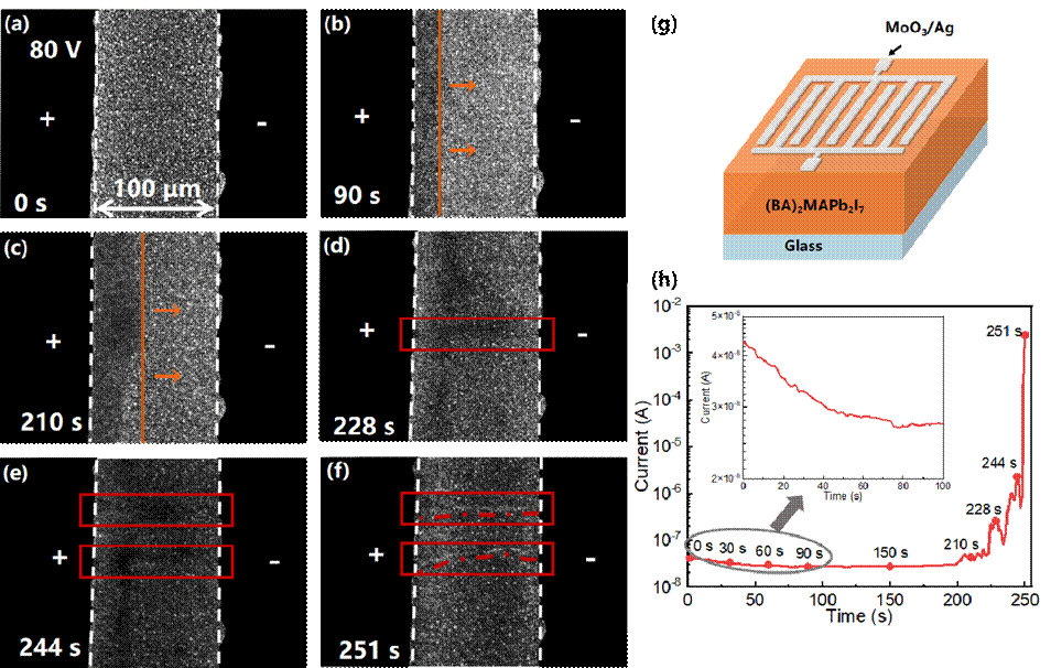 为了实时原位研究准二维钛矿忆阻器中导电丝的形成过程,本团队利用具有自主搭建的具有完全知识产权的荧光成像显微镜来观察样品的变化。如图1,在施加偏压的初始阶段,样品呈现从正极向负极发生荧光淬灭的离子迁移现象。随后薄膜中间出现黑色细丝;最终在显微镜下观察到了两条明显导电丝。通过对应的电流-时间(I-t)曲线,团队发现电流随着时间发生先下降后激增的现象,这与荧光成像显微镜观察的现象一致。
