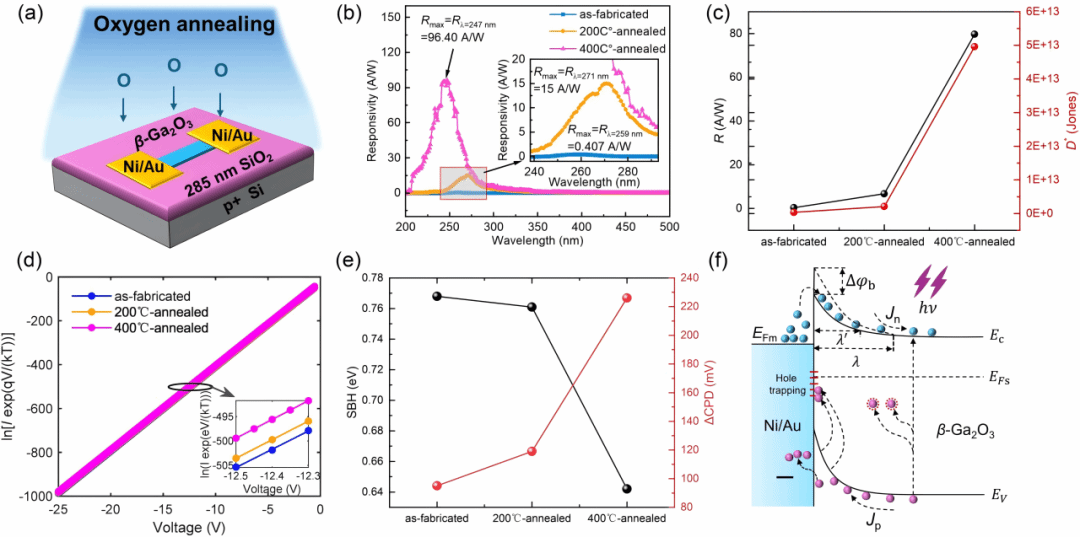 此外,研究团队通过基于PDMS的干法转移技术,将机械剥离的β-Ga2O3单晶材料转移至Si/SiO2衬底上,制备了具有金属-半导体-金属(MSM)结构的日盲光电探测器。器件在不同温度条件下进行氧气退火处理后,发现其在400℃退火条件下展现出的性能优于同类型β-Ga2O3结构器件,该器件具有高响应度(96.40 A/W)和高增益(760.58)特性。研究成果如图6所示。