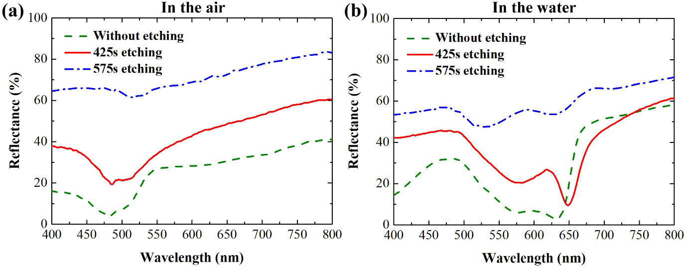 图3:在无等离子体刻蚀、优化刻蚀(425 s)和过度刻蚀(575s)三种情况下,空气和水中等离激元超表面的反射光谱