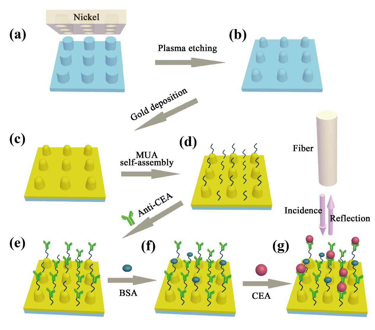 此项工作研制了一种低成本的轻薄柔性生物功能化等离激元超表面,用于检测人体血清中的肿瘤标志物。该研究在柔性轻质聚合物衬底上,采用纳米压印、等离子体刻蚀和金属薄膜沉积等简易加工工序,通过工艺技术和电磁模拟优化制备周期性金纳米凸起结构阵列的等离激元超表面,利用抗原与抗体的特异性结合,实现在可见光波段的高灵敏癌胚抗原(CEA)检测(如图1所示)。这里检测的癌胚抗原是一种广谱肿瘤标志物,在恶性肿瘤的鉴别诊断、病情监测、疗效评价等方面具有一定的临床价值,因此在人体血液检查方面有着重要参考价值。与传统技术相比,该方案在衬底成本、重量、工艺步骤及加工时间等方面优势明显,且具有易弯折和不易破碎等优点(如表1所示);所制备的周期性金纳米凸起阵列排列整齐均匀,传感性能良好。该技术方案不仅传感器件制造简易廉价,而且检测系统紧凑灵活,将很好地服务于未来柔性可穿戴便携式生物传感器件和系统的开发。