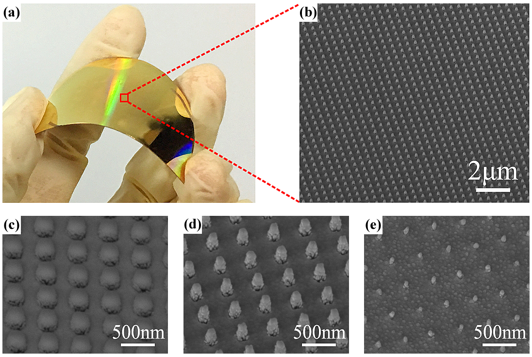 等离激元超表面生物分子传感器的应用通常要求均匀的周期纳米结构,且需要运用量产化的工艺实现大面积和低缺陷率的精细化纳米图案制备。然而,为了确保稳定可靠的高传感性能,大多数传感器的制备需要在诸如硅、玻璃或石英等硬质衬底上进行耗时而昂贵的纳米图案化工艺处理,这极大限制了其在轻型、可穿戴、抛弃式生物传感器方面的应用。除此之外,等离激元超表面的生物功能化和生物兼容性对于生物分子传感也起到非常关键的作用。目前,低成本、高性能的柔性生物功能化等离激元超表面传感器仍有待进一步的开发和实用化。