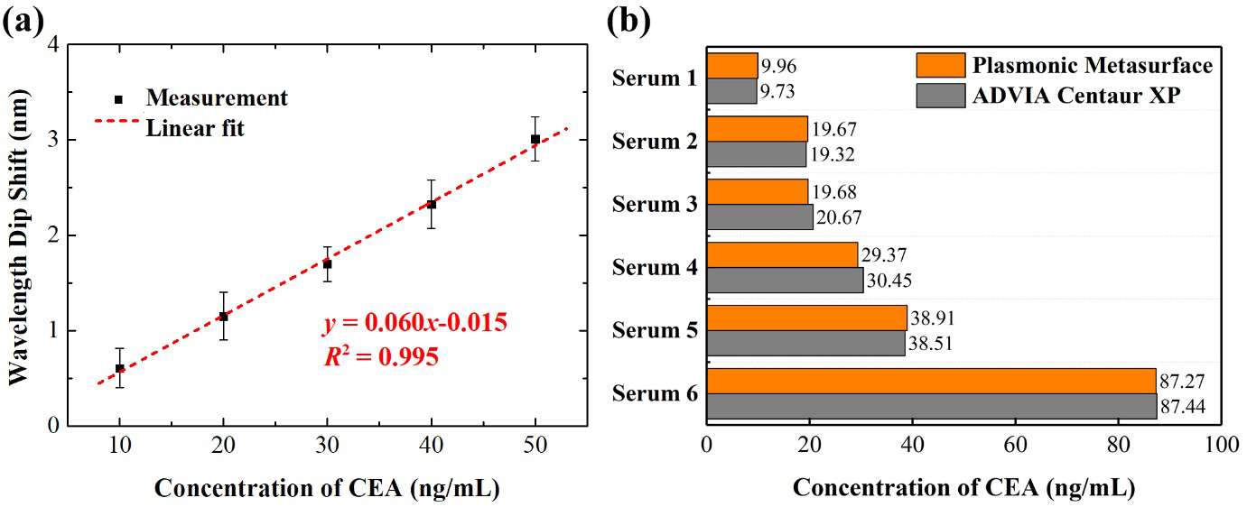 借助工艺调控的生物功能化等离激元超表面,研究者实现对肿瘤标志物的光传感且进一步实现人体血清中癌胚抗原的检测(见图4)。该技术采用集成化反射式光纤探头对一定浓度梯度的癌胚抗原溶液进行光学测量,通过等离激元谐振谷偏移获取超表面传感曲线,并应用于未知浓度癌胚抗原的测定。研究者采用优化后的超表面实现人体血清样本中癌胚抗原浓度从小于10ng/ml到大于87ng/ml的测定,检测结果与医院商用化西门子化学发光免疫分析系统的测定结果吻合度极高,最大数据偏差小于4.8%。因为癌胚抗原浓度20 ng/ml通常被认为是癌症诊断和预后的关键阈值,所以该工作所制备的超表面传感器有望应用于癌胚抗原相关的癌症早期筛查。综上所述,该研究使得大面积、低成本表面等离激元超表面量产化制造成为可能,在医学体外检测领域具有广阔应用前景,将有力地推动高性能便携式生物医学传感技术的发展。