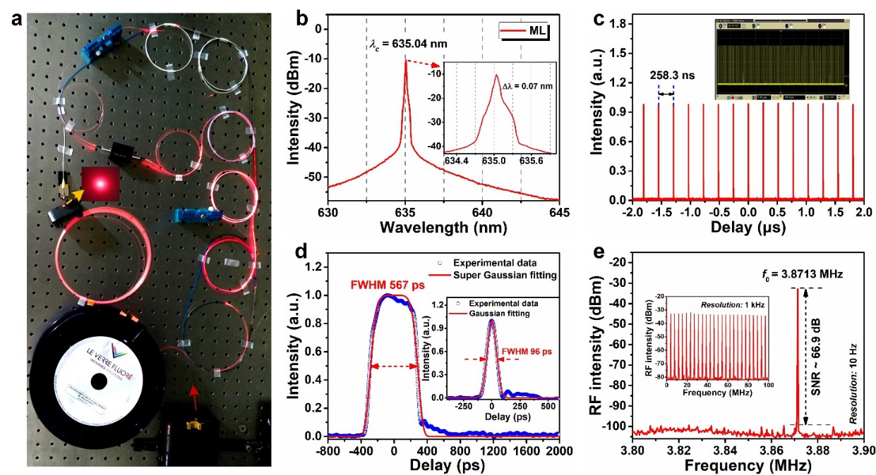 基于数值模拟的结果,课题组采用Pr/Yb共掺ZBLAN光纤作为可见光增益介质,利用非线性放大环镜作为锁模器,首次实验实现了小型化可见光被动锁模光纤激光器,获得锁模中心波长为635 nm(红光)的皮秒脉冲激光(见图2)。该研究成果是在可见光范围内向小型化超快光纤激光器迈出的重要一步。将为可见光超快光纤激光在精密光谱学、生物医学、显微成像、光通信、科学研究等领域的应用奠定基础,具有很好的研究潜力和应用价值。