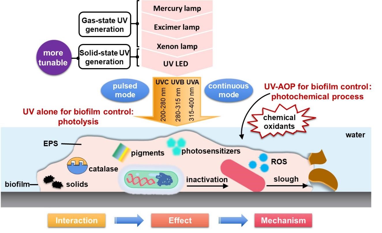 该综述聚焦水和废水处理工业基础设施中的生物膜,从UV杀菌消毒的基本原理出发归纳出生物膜对于UV的四种拮抗机理;总结了UV光源器件的演变过程和类型特征;分别从分解本体、灭活包埋菌、抑制成膜等不同技术路线,阐述了使用UV辐照控制水工业设施生物膜的技术效果,提出了UV LED在生物膜控制方面的优势和挑战;拓展分析了基于UV辐照和高级氧化耦合过程的生物膜控制方面的研究进展,提出了二者协同作用机制;揭示了UV在解决水设施生物膜问题上的应用潜力和未来可能的发展方向。