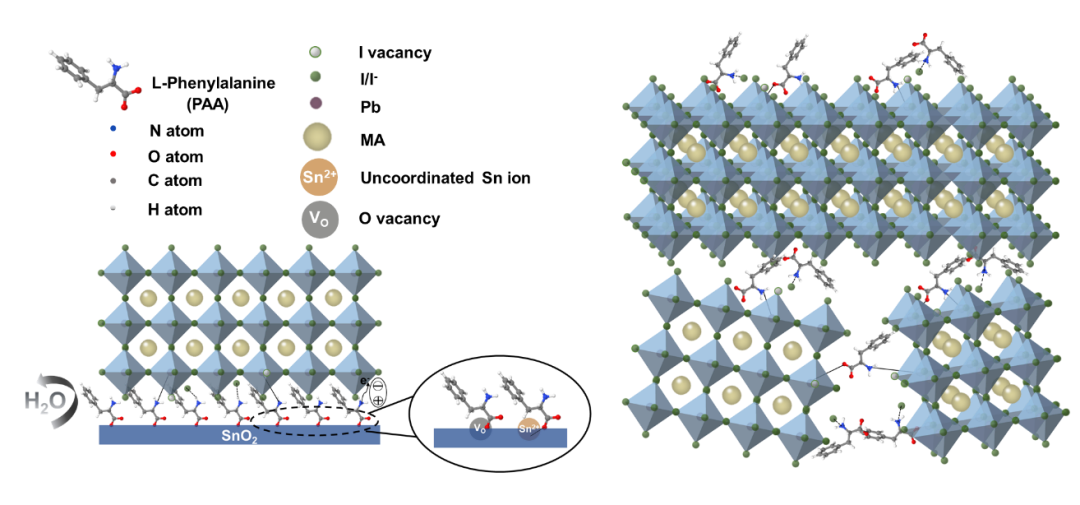 图1展示了苯丙氨酸对氧化锡电子传输层和钙钛矿吸光层的钝化机制:(1)对界面缺陷的钝化可减少载流子被界面缺陷捕获;(2)渗入钙钛矿层晶界/表面的氨基酸分子可与金属悬挂键配位,并与碘离子形成氢键;(3)氨基酸层导致界面电场的形成,从而提升界面电荷转移。