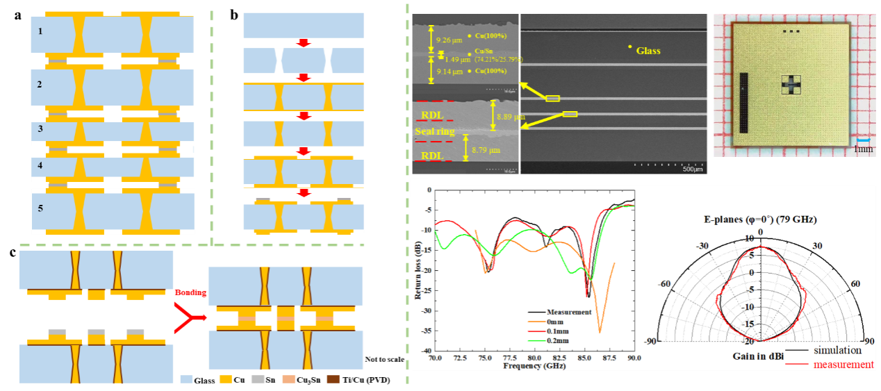 基于玻璃衬底的封装工艺具有高精度和低成本的特点,玻璃通孔(TGV)技术可实现三维互连结构。于大全教授团队成功地将多层玻璃基板堆叠的方式运用于毫米波封装天线的设计与制造。采用高能量密度的皮秒激光对玻璃晶圆进行永久性诱导损伤,再以湿法刻蚀方式形成高深宽比的玻璃通孔;配合电镀铜填实技术实现片内信号互连。随后,各层晶圆独立加工形成再分布层(RDL)与铜锡键合层,采用低温铜锡互扩散共晶键合技术将各层逐次键合堆叠。铜锡反应产生的铜锡化合物,提供了高可靠性和低损耗的片间信号传输。该研究工作旨在利用三维堆叠技术在结构的Z轴方向上形成三维集成,更适用于天线与大多数器件的集成,有利于毫米波天线的小型化设计。