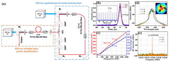 图(a)635 nm时空锁模光纤激光器与超快激光功率放大器装置图,(b)时空锁模时域特性,(c)输出功率与脉冲能量曲线,(d-e)时空锁模光谱及频谱特性