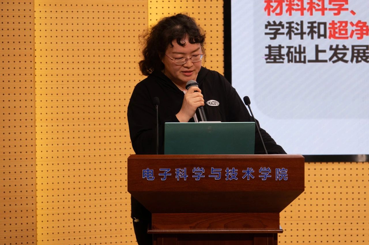 张丹从二极管的制作引入,激发同学们的兴趣,介绍了微电子科学与工程专业的半导体产业链、专业课程安排、学生获奖情况、毕业去向等方面的情况。