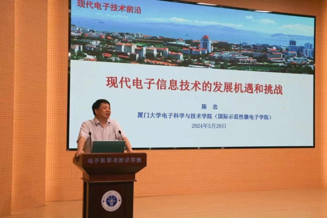 陈忠以生活中常见的手机和互联网引入,介绍了量子通信、物联网、Web 3.0、云计算、ChatGPT等多类电子技术领域,让同学们对电子学科的专业方向有了初步的概念。他指出新经济发展所需要的新工科更加凸显学科交叉与综合的特点,人才培养要学术研究和技术研发并重。电子学科是厦大工科中最有历史、最有前景的学科之一,也是国家和行业发展急需的关键学科。