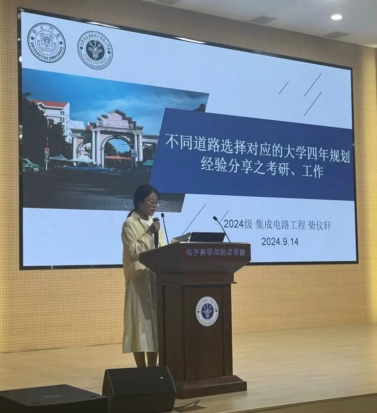 为帮助2024级本科新生把握大学学习和生活节奏,深入了解大学科创竞赛资讯,9月14日中午,在南存钿楼C栋4楼报告厅,三位优秀的学长和学姐以科创竞赛为主线,围绕比赛过程、学习保研、考研之路分享了丰富宝贵的实战经验和心得建议。电子信息类2024级全体新生参加了本次活动。