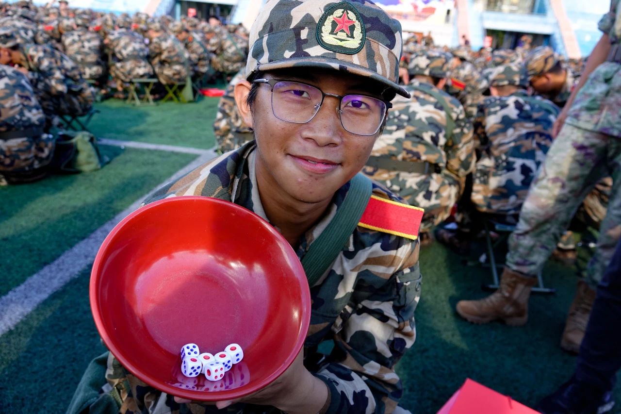 在中秋博饼活动中,芯青年们围成一圈,摇骰子,获奖品,吃月饼,用博饼的甜冲刷着军训的苦。