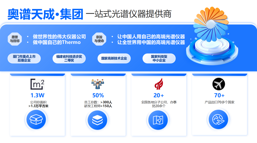 公司也先后荣获了厦门市重点上市后备企业、福建省瞪羚企业、福建省专精特新、福建省科学技术进步奖二等奖、福建省科技小巨人、厦门市双百人才计划A类重点引进项目等一系列荣誉,此次获评国家级专精特新“小巨人”,是奥谱天成在光谱分析领域产品创新力、技术领先力、卓越影响力的集中体现,也是对奥谱天成在推动国产高端仪器自主研发、助推仪器仪表产业链竞争力方面所做出贡献的充分肯定。