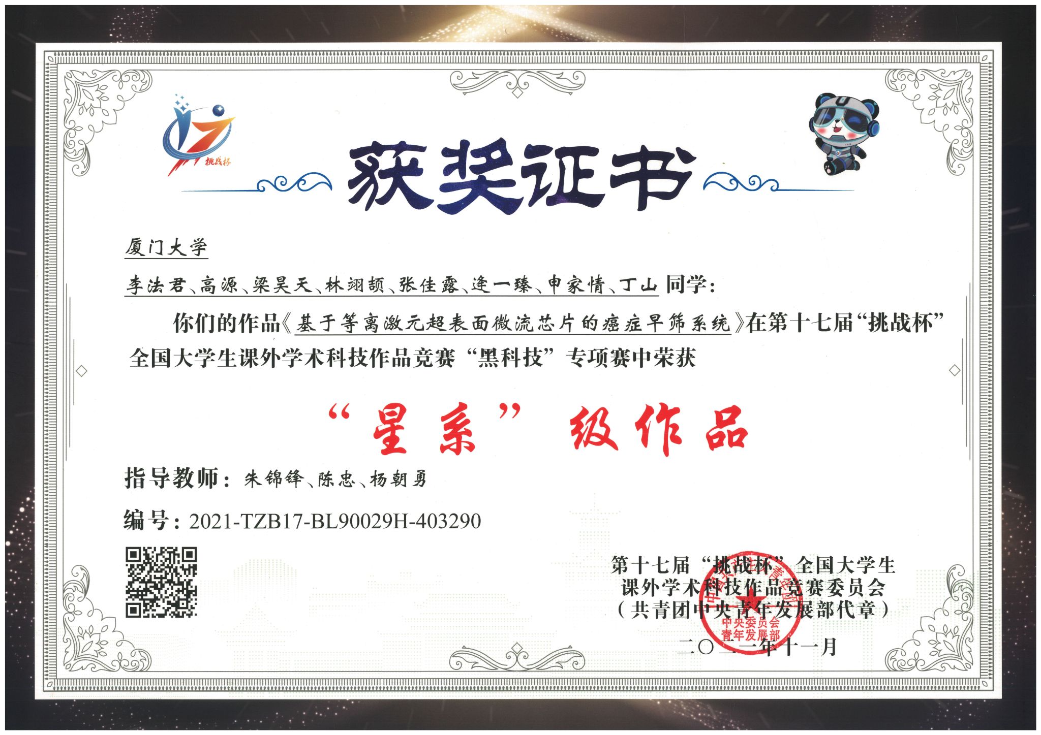 第十七届“挑战杯”全国大学生课外学术科技作品竞赛于3月26日至28日完成终审决赛,我校荣获一等奖1项、二等奖1项以及三等奖2项。其中,我院报送参加的“基于等离激元超表面微流芯片的癌症早筛系统”作品获得本届挑战杯全国一等奖和黑科技专项赛星系级作品(最高奖)。