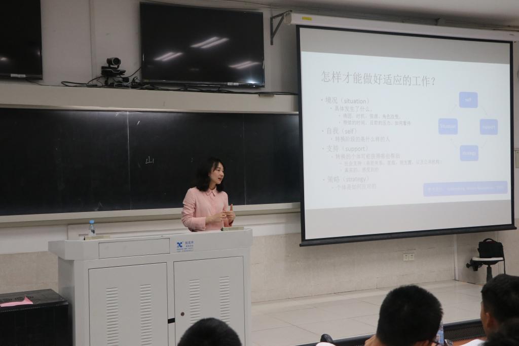 姚莹颖老师以“人生五个阶段的六次转折”为切入点,打开了话题。从心理学角度出发,引出了“适应——同化和顺应”的专业概念,并详细介绍了“境况-自我-支持-策略)”的适应方法体系。
