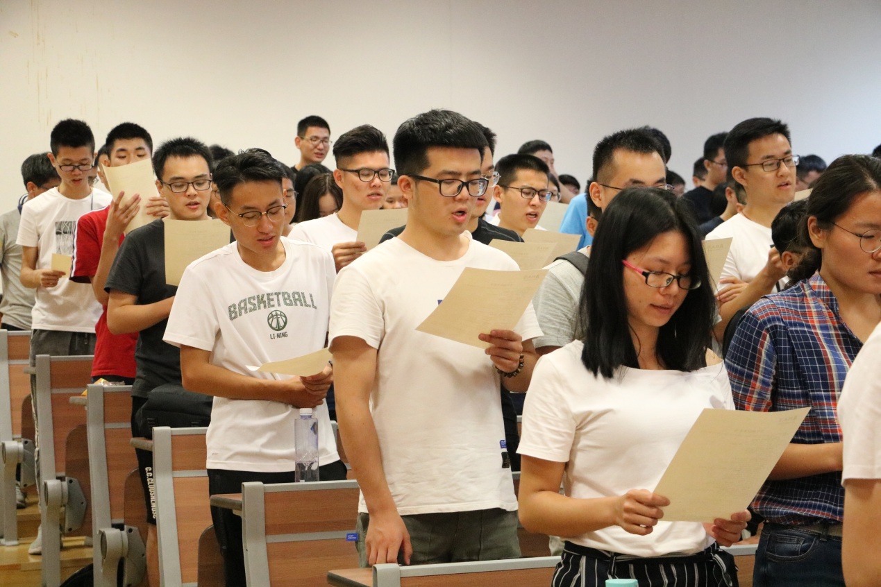 正式开学典礼开始前一个小时,学院邀请艺术学院宣焱同学给新生教唱《厦门大学校歌》,在宣焱的带领下,研究生新生很快便学会了校歌,“自强!自强!学海何洋洋!”雄浑而高亢的歌声在海韵园117室久久回荡,显示了新同学对厦门大学的热爱和新生活的向往。