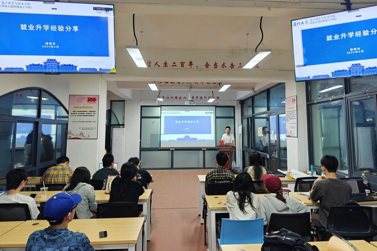 为帮助学生进一步明确发展方向、及时做好发展规划,6月3日晚,电子科学与技术学院2024年硕士研究生升学就业分享主题党日活动在博学二一站式学习共享空间顺利举办。活动邀请了学院党政辅导员陈斯杰以及五名2021级硕士毕业生进行经验分享。活动由电磁声学研究院硕士生2023级党支部书记周成凤主持。