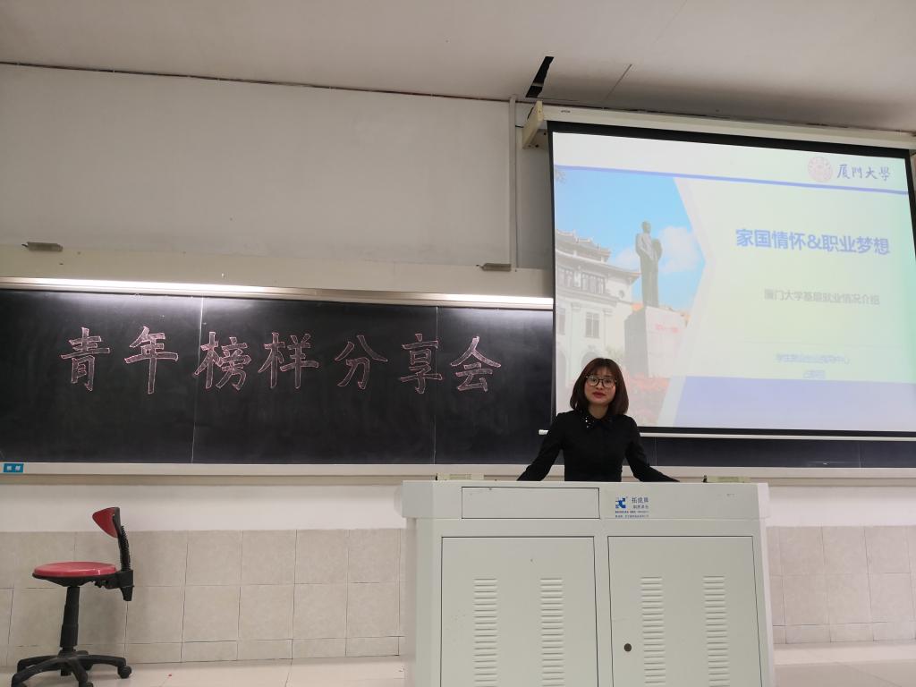5月10日下午15:00,由电子科学与技术学院就业指导中心举办的“青年榜样”之“家国情怀,职业梦想”就业分享会在厦门大学学生公寓教学楼206顺利举办。本次分享会邀请了厦门大学学生处学生就业创业指导中心占群丽老师、电子工程系2015级博士生陈迪萌、电子工程系2015级本科生王欢作为主讲嘉宾,学生公寓办吴建梅老师、辅导员刘锦锗老师以及2016级本科生参加了本次分享会。