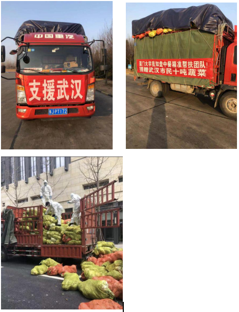 我们不仅给湖北地区募集善款,用于购买相应的医疗物资,我们还为武汉市民送去了新鲜的蔬菜。“我只盘中餐”团队还为武汉市民捐了10吨的蔬菜,蔬菜是从安徽阜阳,连夜送到了湖北武汉当地的小区里面。但是当时正值武汉地区进行交通管制,车子进不去武汉,进去的也只有运送了医疗救援物资的才可以进去,这也是麻烦到了我们,最后经过多次与武汉方的沟通,开具了多个证明,才得以让司机进去武汉。蔬菜顺利运送到市民手里后,当听到武汉受捐方一个姐姐的声音,她在电话里激动地说“你们送来的蔬菜我们收到了,我们都已经送到居民家里,真的是太感谢了,太谢谢你们了,可爱的厦大同学们”,我就觉得我们的努力没有白费,这一切都是值得的。