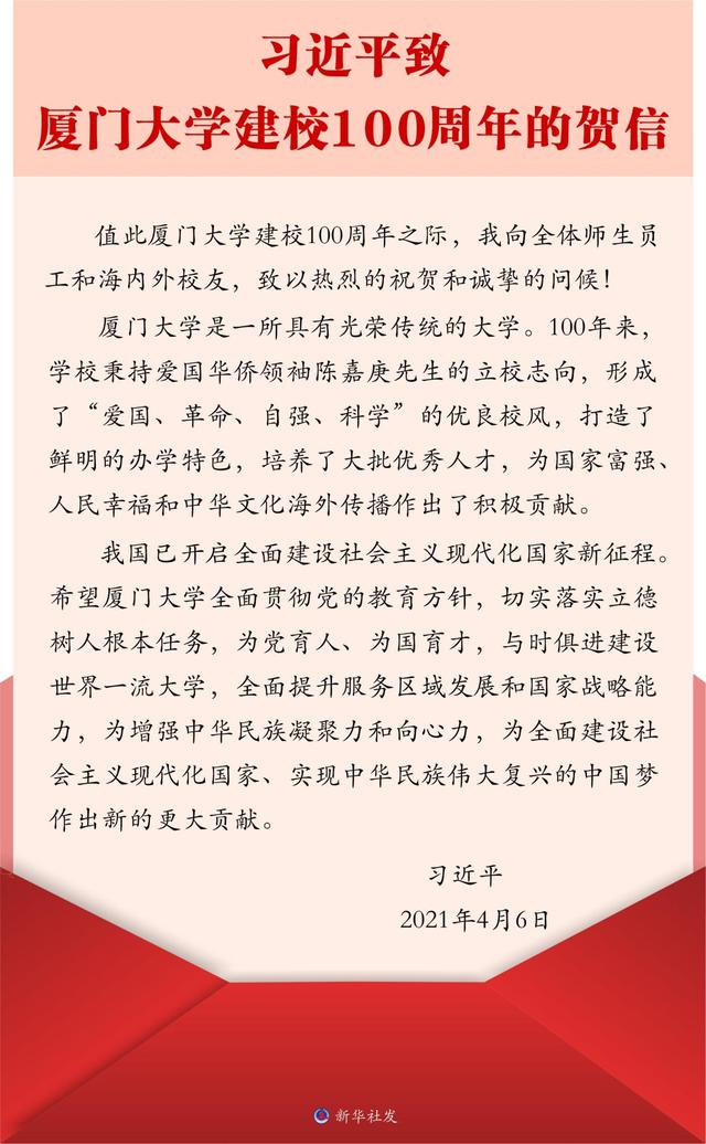 4月6日,厦门大学百年校庆之际,中共中央总书记、国家主席、中央军委主席习近平致信祝贺厦门大学建校100周年,向全体师生员工和海内外校友致以热烈祝贺和诚挚问候。