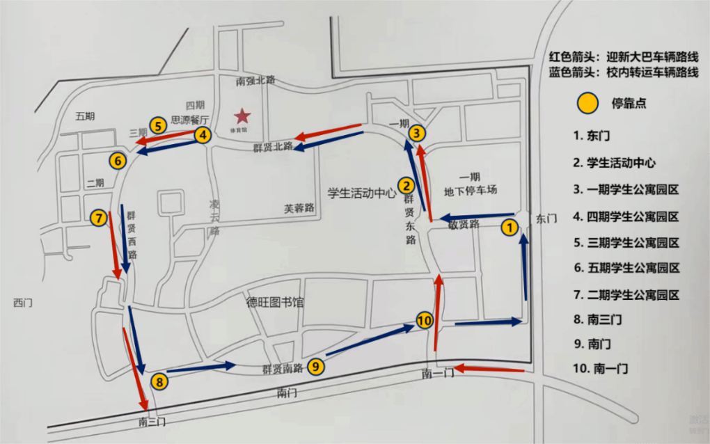 学校接站迎新大巴到站后,从南一门入校,听志愿者报站,在对应的学生公寓下车,跟随学院志愿者前往迎新点注册报到。