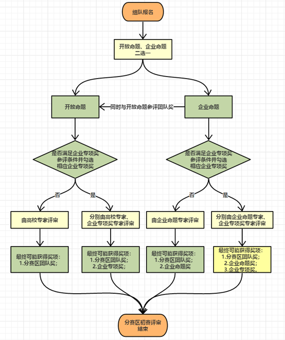1.竞赛赛程赛制较往届基本保持不变,分为技术竞赛和商业计划书专项赛两大部分,两部分竞赛相互独立,组队、报名、评审、奖励工作均分开进行,互不影响。技术竞赛部分又分为企业命题和开放式命题。企业命题,开放命题二选一,其中参与企业命题的队伍可以同时参加对应技术方向开放命题评审。