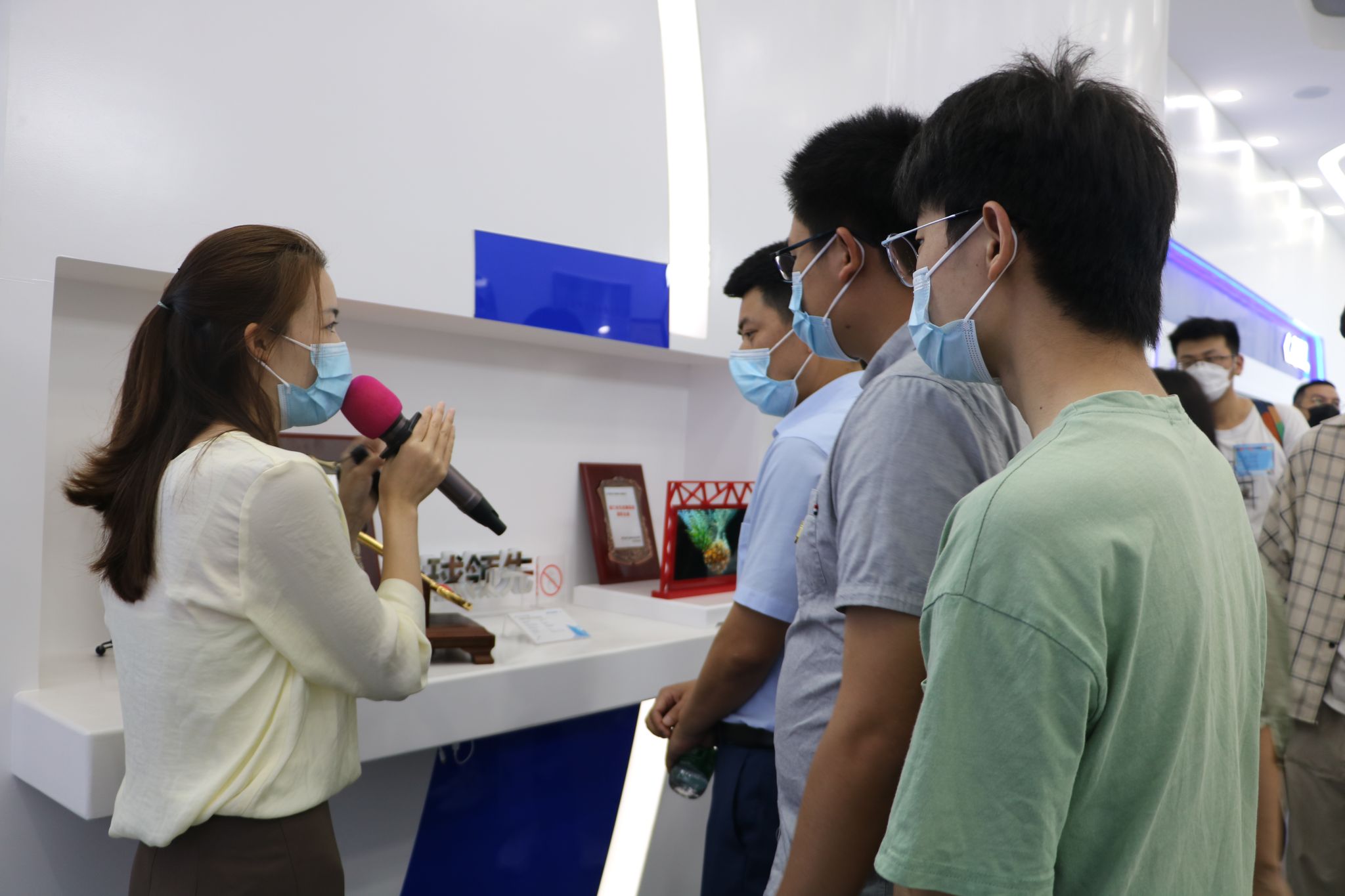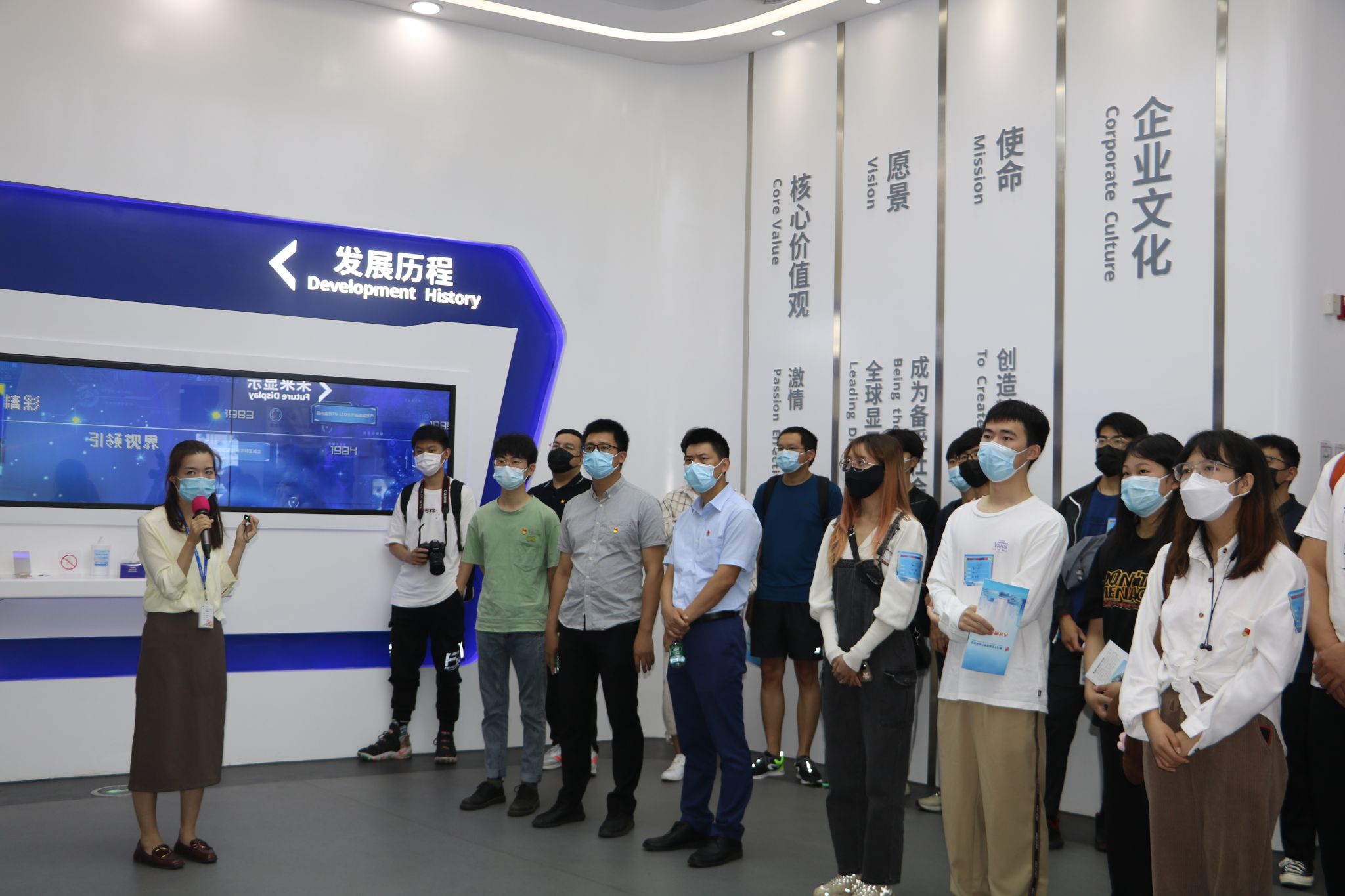 随后,在技术人员的带领下,师生一行人实地参观天马微电子显示面板智能生产线。一行人观看了一块显示面板的“诞生之旅”,并结合走廊上的生产原理流程图,进一步了解了化学气相沉积、物理气相沉积、退火、光刻、刻蚀、检测维护等工艺流程。通过近距离参观,师生一行人对工厂的智能化水平表示惊叹,学生也感受到了专业知识与实际生产结合的魅力。