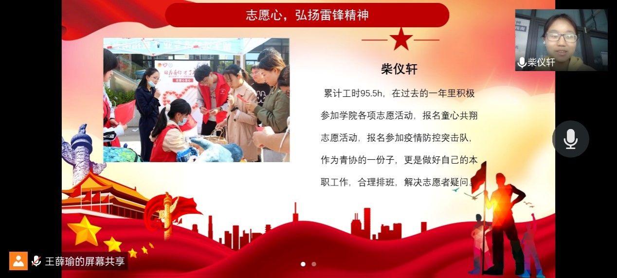 志愿者柴仪轩分享了自己作为学院青年志愿者协会干事在任职期间参与的许多活动,学院迎新、搬迁以及运动会等,每次活动虽说需要花费时间和精力,对于她来讲更多是学到了组织以及参加活动的能力,还有协调能力与人沟通的能力,每次活动的顺利举办,都是她向前勇敢迈步的不竭动力,这类志愿工作让她收获到了成长。